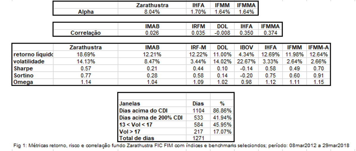 Em março o fundo Zarathustra FIC FIM também completou seis anos de vida. Nesse período atingiu métricas de desempenho, risco e retorno que, tanto relativo aos benchmarks como em termos absolutos, são excepcionais. O fundo entregou um retorno anualizado de 18,7%, ou 216,8% do CDI, gerando um alpha (retorno descorrelacionado dos benchmarks) de 8.04% (fig. 1). Apresentou baixa correlação com os benchmarks de mercado e índices de fundos multimercado (IHFA, IFMM e IFMM-A) o que o torna, além de excelente investimento, ativo ideal para compor uma carteira diversificada.