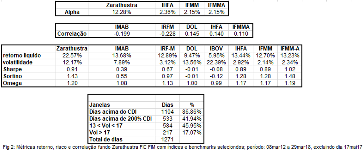 Cabe observar de que as métricas de desempenho do fundo foram fortemente afetadas pelo movimento do dia 18 de maio de 2017 (day after da revelação de que Joesley Batista gravara o presidente Michel Temer, provocando pandemônio temporário nos mercados). Foi um dia atípico não apenas pela magnitude do choque financeiro mas porque, ineditamente no histórico do fundo, praticamente não houve negociação durante a sessão enquanto investidores aguardavam a divulgação da gravação. De fato, quando a gravação veio a público o mercado retomou negociações e os preços acharam um equilíbrio significativamente melhor do que acabou usado nos ajustes (que são as referências para formar a cota do fundo). Por essa razão achamos interessante apresentar o hipotético desempenho (frisando-se que é apenas para efeitos de comparação), excluído o impacto daquele dia (fig. 2). Como esperado, os índices de risco-retorno melhoram significativamente e as correlações caem (ou ficam mais negativas) substancialmente: