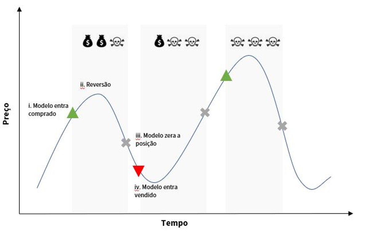 O Fundo Zarathustra FICFIM teve um rendimento de -2,46% no primeiro trimestre de 2019. O desempenho pode ser atribuído, predominantemente, aos modelos de tendências single-asset. A performance desses modelos sofre em mercados com muitas oscilações de preços e sem tendência definida, como foi em fevereiro e março (por causa das idas e vindas da Reforma da Previdência). Isto, porque os modelos entram e saem de posições rapidamente (esta última característica, desejável do ponto de vista de gestão de risco) gerando uma dinâmica como a da figura abaixo: o mercado começa a subir, o modelo compra o ativo (i), o mercado reverte (ii), o modelo “zera” a posição realizando um prejuízo (iii), o modelo se posiciona na direção contrária (iv), o mercado reverte novamente e assim por diante até que, eventualmente, uma tendência se estabeleça e o modelo volte a ganhar dinheiro.