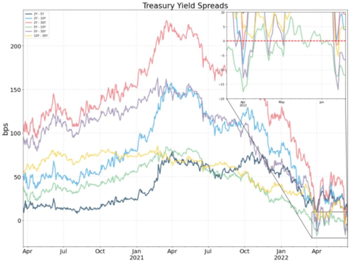 Em abril, o mercado havia digerido mal a guinada hawkish do FED. O selloff que se seguiu foi particularmente doloroso. Diferente do padrão nas últimas duas décadas, tanto ações quanto títulos do Tesouro (os dois ingredientes da carteira “60/40”, esteio do investidor americano) sofreram pesadas perdas. O índice SPX (futuro do S&P 500) caiu mais de 17% entre março e maio, enquanto a taxa dos títulos de 5 anos quase dobrou, de 1,50% para 2,95% (uma queda de cerca de 6% no preço).