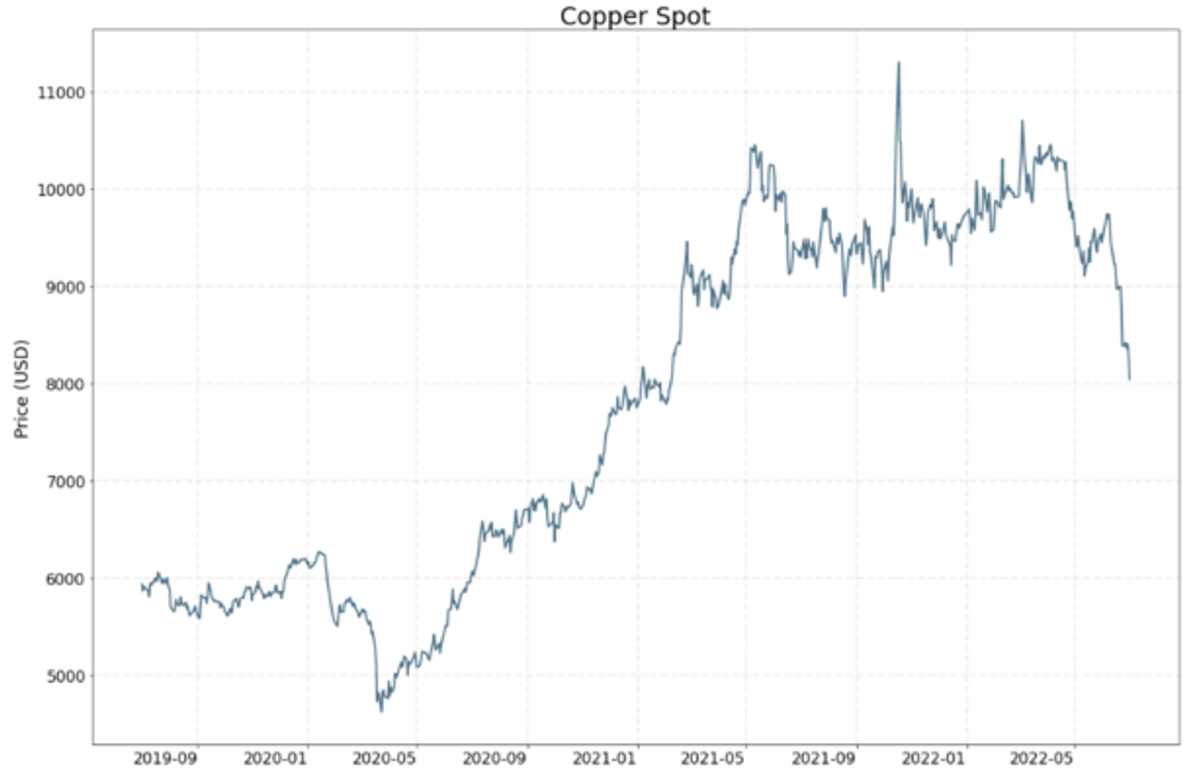 E quase todos agora se encontram em igual sinuca de bico: ao subir juros em meio a uma enorme crise energética e choques de oferta, correm risco de jogar suas respectivas economias em recessão em 2023 ou ainda em 2022. Uma série de indicadores aponta para esse cenário. Entre eles, destaca-se a inversão da curva de juros americanos (Figura 4) — que possui alta taxa de acerto na previsão de recessões— e a forte queda nos preços do cobre (Figura 5), termômetro da atividade industrial. Como mencionado, as expectativas de inflação sofreram um tombo em junho. Em parte, o tombo reflete o endurecimento da política monetária do FED. Mas também o risco crescente de recessão.