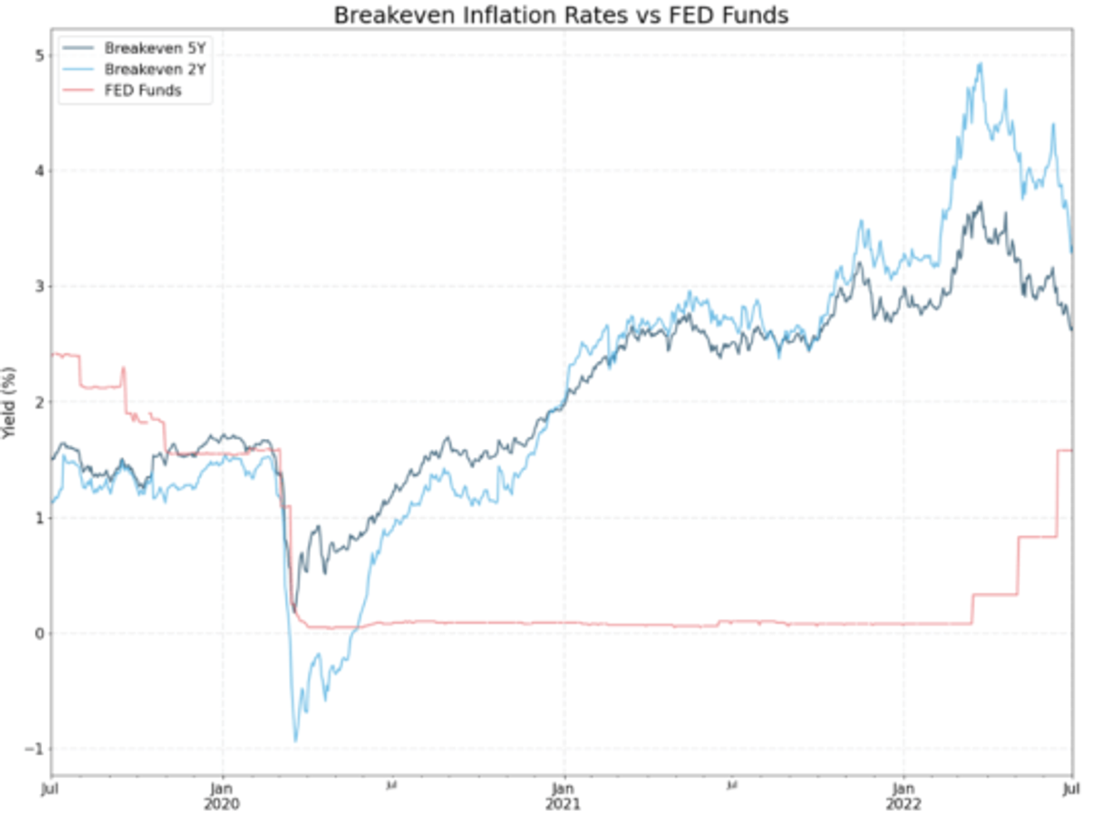 Mas uma estimativa baseada na Regra de Taylor, um modelo simples que estima a taxa de juros necessária para atingir determinada meta de inflação, sugere que o Fed Funds precisaria subir a um intervalo entre 4% e 7% para trazer a inflação à meta de 2%. A boa notícia é que as expectativas de inflação despencaram após a alta de junho. A má notícia é que despencaram porque o mercado passou a temer recessão.