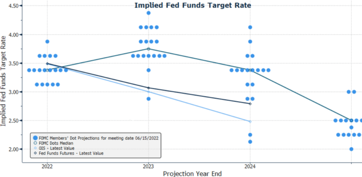 Não obstante o estrago infligido pelo FED ao mercado até aqui, o sofrimento provavelmente não terminou (“as chibatadas continuarão até que a moral melhore…”). A taxa básica continua distante da inflação — 1,75%, versus 8,6% de inflação corrente e 4,3% de inflação implícita no TIPS (os títulos indexados à inflação) de 1 ano ao final de junho. O dot-plot do FED mostra a taxa mediana subindo até chegar à máxima de 3,75% em 2023, para depois começar a cair.