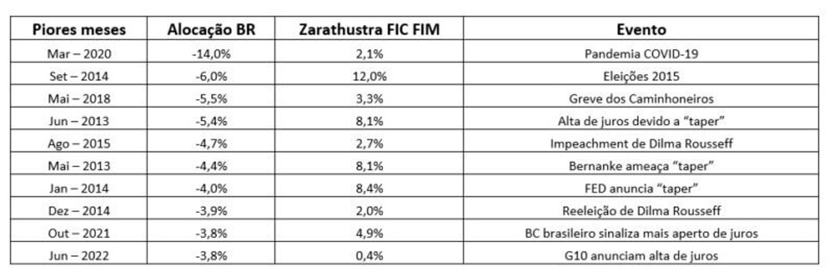 O desempenho do Zarathustra FIC o coloca entre os mais rentáveis e consistentes fundos do mercado brasilieiro. A tabela 1, que abrange o período desde a criação do fundo, em março de 2012, até o terceiro trimestre de 2022, mostra que o fundo Zarathustra bateu todos os benchmarks do mercado brasileiro. A tabela 2 mostra que a correlação entre o Zarathustra e os benchmarks é baixa. O período, mais de dez anos, abrange extremos de euforia e depressão – tornando seguro afirmar que o desempenho não foi obra do acaso. A tabela 3 apresenta os maiores selloffs mensais do mercado desde a criação do Zarathustra FIC, medidos por um índice composto de 70% IMA-B (índice de renda fixa) e 30% Ibovespa, e o retorno mensal correspondente do fundo. Esses eventos incluem a pandemia de COVID, greve dos caminhoneiros, taper tantrum, etc. A tabela ilustra, de forma dramática, a extraordinária propriedade do Zarathustra de desempenhar positivamente quando tudo mais está derretendo.