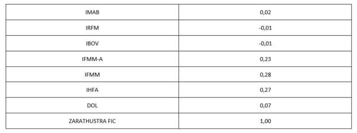 Correlações entre Zarathustra FIC e benchmarks (segundo trimestre 2012 a terceiro trimestre 2022)