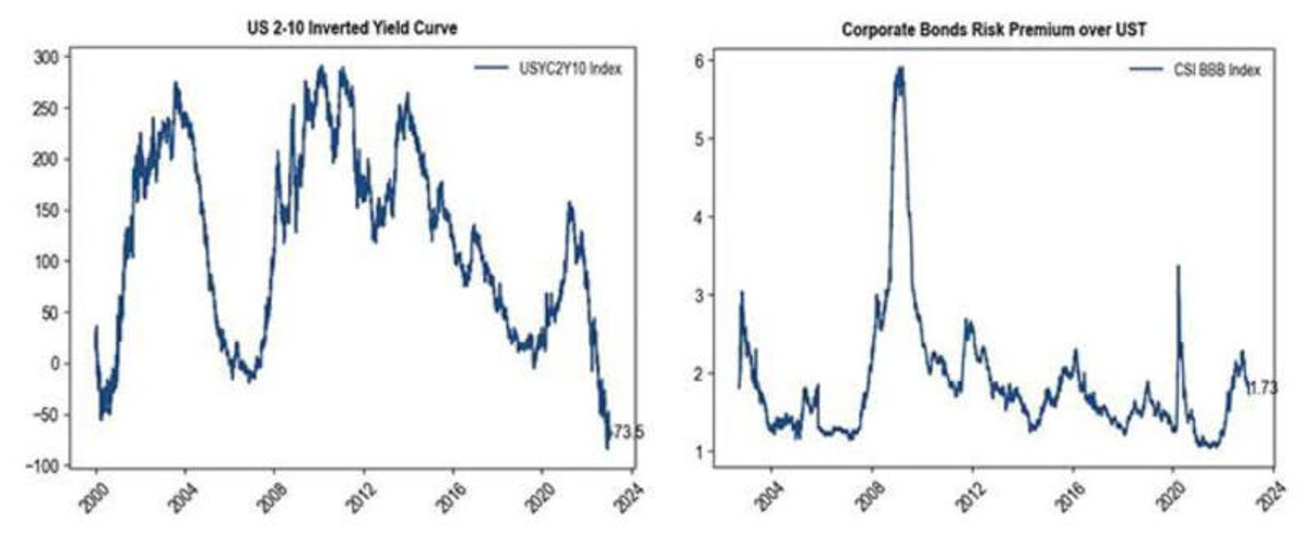 Pessimismo em relação à recessão é maior na inclinação da curva de juros do que nos spreads de crédito. Fonte: Bloomberg.