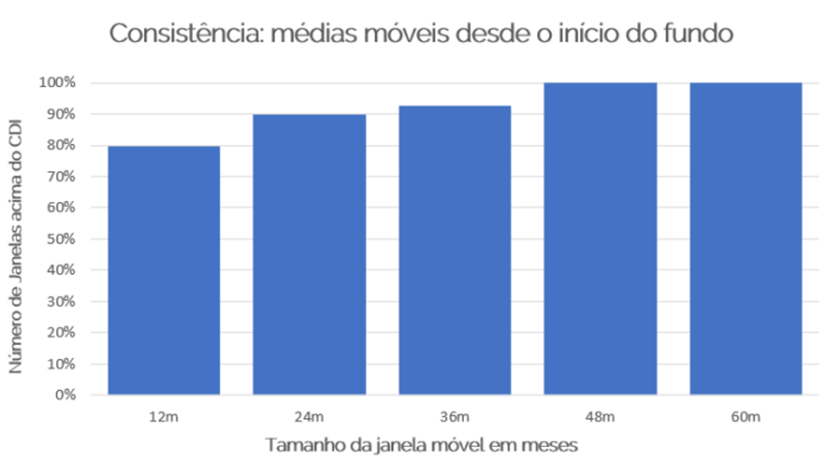 Com essa análise podemos ver que, caso um investidor tenha permanecido 12 meses no fundo, ele teve 80% de chance de ter um resultado acima do CDI. No caso de janelas de 24 meses, essa probabilidade sobe para 90%. Para 36 meses, 93% e para 48 e 60 meses, 100%.