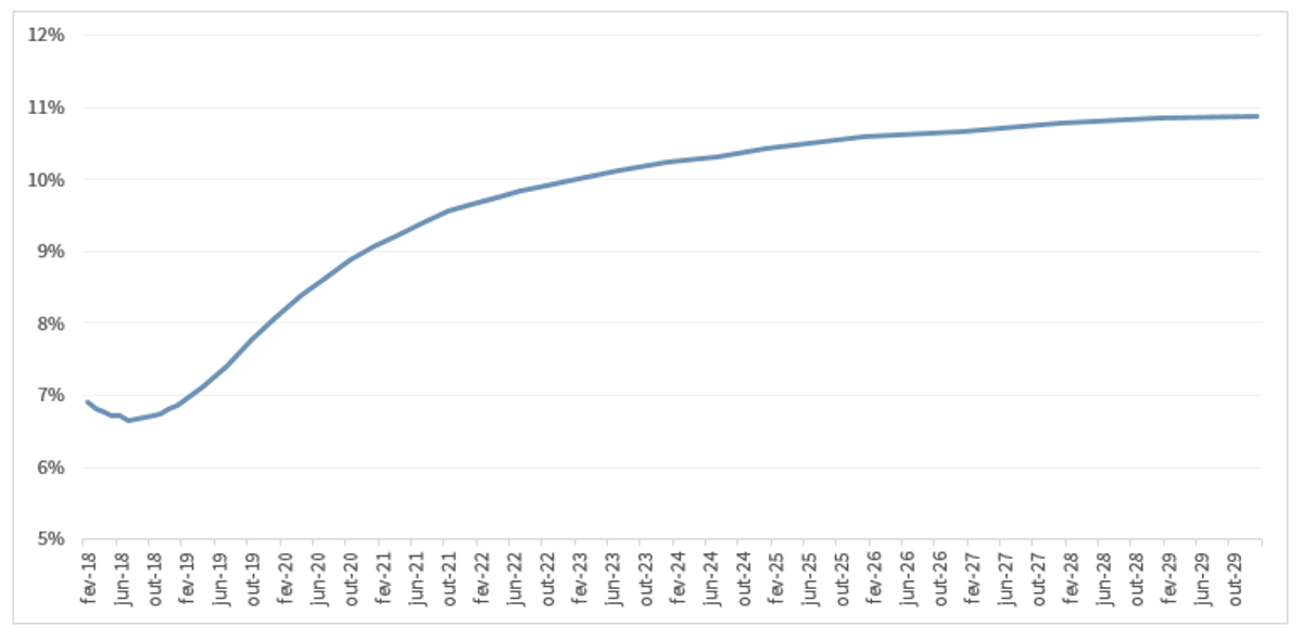 O Brasil, que logrou avanços importantes em 2017 – sobretudo, o que parece ser início de uma recuperação cíclica, com inflação sob controle (ineditamente, abaixo do piso da meta) e juros no nível mais baixo da história – tampouco se encontra em situação confortável. Sem a aprovação da reforma da Previdência, tragicamente sabotada no episódio Joesley, as contas do setor público caminham para inevitável colapso – a exemplo do que já ocorre em alguns estados. Além disso afigura-se uma eleição presidencial que, a nove meses do pleito, é a mais incerta das últimas décadas. Realizada na esteira do maior escândalo de corrupção da história brasileira (quiçá, planetária), sobre os escombros do sistema político-partidário tradicional, ela convida candidaturas populistas. Neste momento, despontam dois nomes com este perfil: o ex-presidente Lula, réu em processo de corrupção, e Jair Bolsonaro. O primeiro, se ora adota máscara e discurso populistas, governou como um pragmático centrista. O segundo é uma incógnita maior. Acena com discurso pró mercado e uma equipe de viés liberal, mas quem o conhece questiona sua sinceridade. Por trinta anos, manteve feroz discurso nacional-desenvolvimentista-estatizante – com forte dose de conservadorismo autoritário – na pior tradição latino-americana. A curva a termo de juros (ver gráfico abaixo) inflete para cima exatamente no mês das eleições – ilustrando, dramaticamente, o enorme custo da incerteza eleitoral.