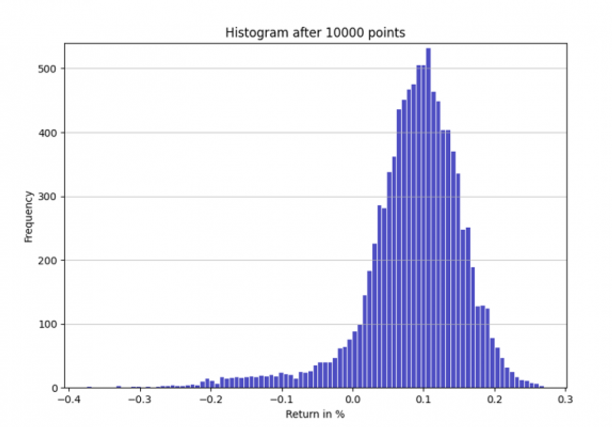 Cem dias se passam, durante os quais a analista continuou coletando dados de retorno. Sua amostra agora contém 10.000 pontos. Nesse período, houve dias turbulentos em que a ação apresentou retornos fortemente negativos (perdas). Novamente, ela traça o histograma (fig. 2) e observa que a cauda esquerda agora é visivelmente mais longa do que a direita. Novamente, ela estima os quatro parâmetros (tabela 2). A média e desvios padrão mudaram e, desta vez, os parâmetros de skewness e kurtosis são não nulos: