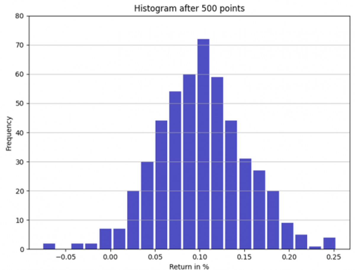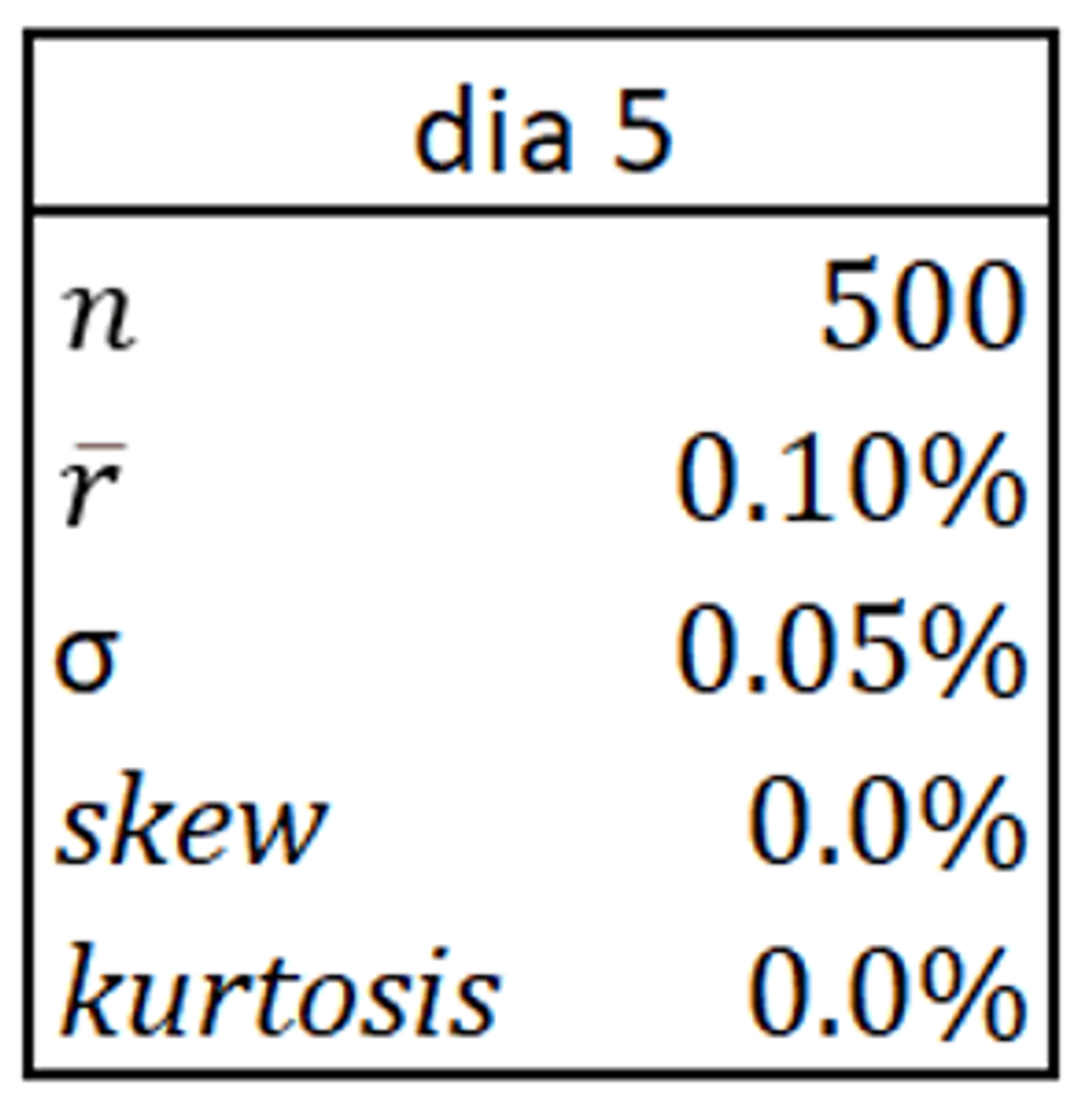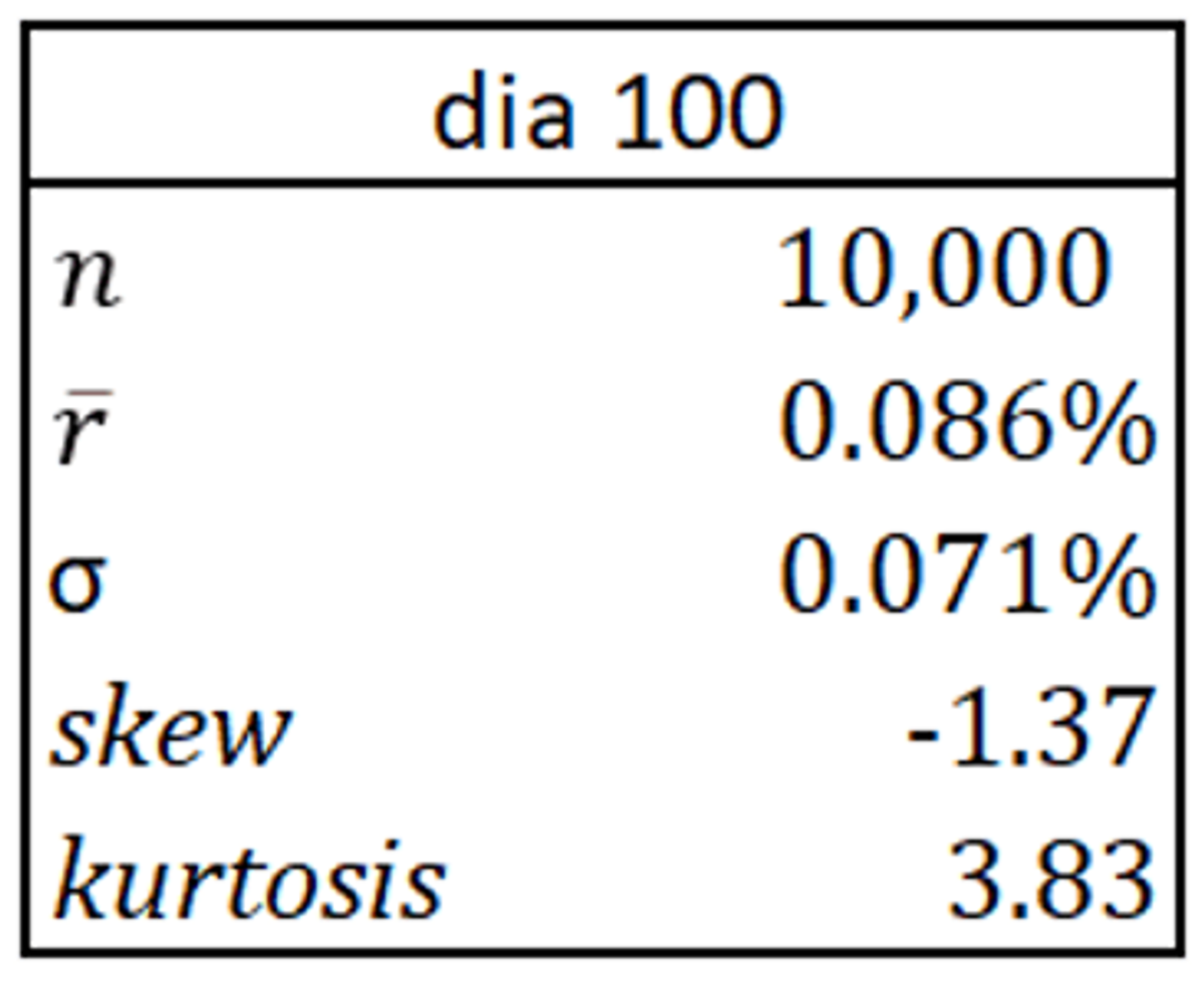 Estes dois parâmetros caracterizam completamente uma distribuição normal. Mas com uma amostra pequena, a analista não pode saber se os retornos são, de fato, gerados por uma distribuição normal. Ela estima dois outros parâmetros, skewness (assimetria da distribuição) e kurtosis (grossura das caudas da distribuição) – que, numa distribuição normal, são iguais a zero – e constata que esses parâmetros são indistinguíveis de zero. Os dados sugerem, portanto, que a hipótese de normalidade é razoável e a analista resolve adotar uma distribuição normal N(0,10%; 0,5%) para modelá-los.