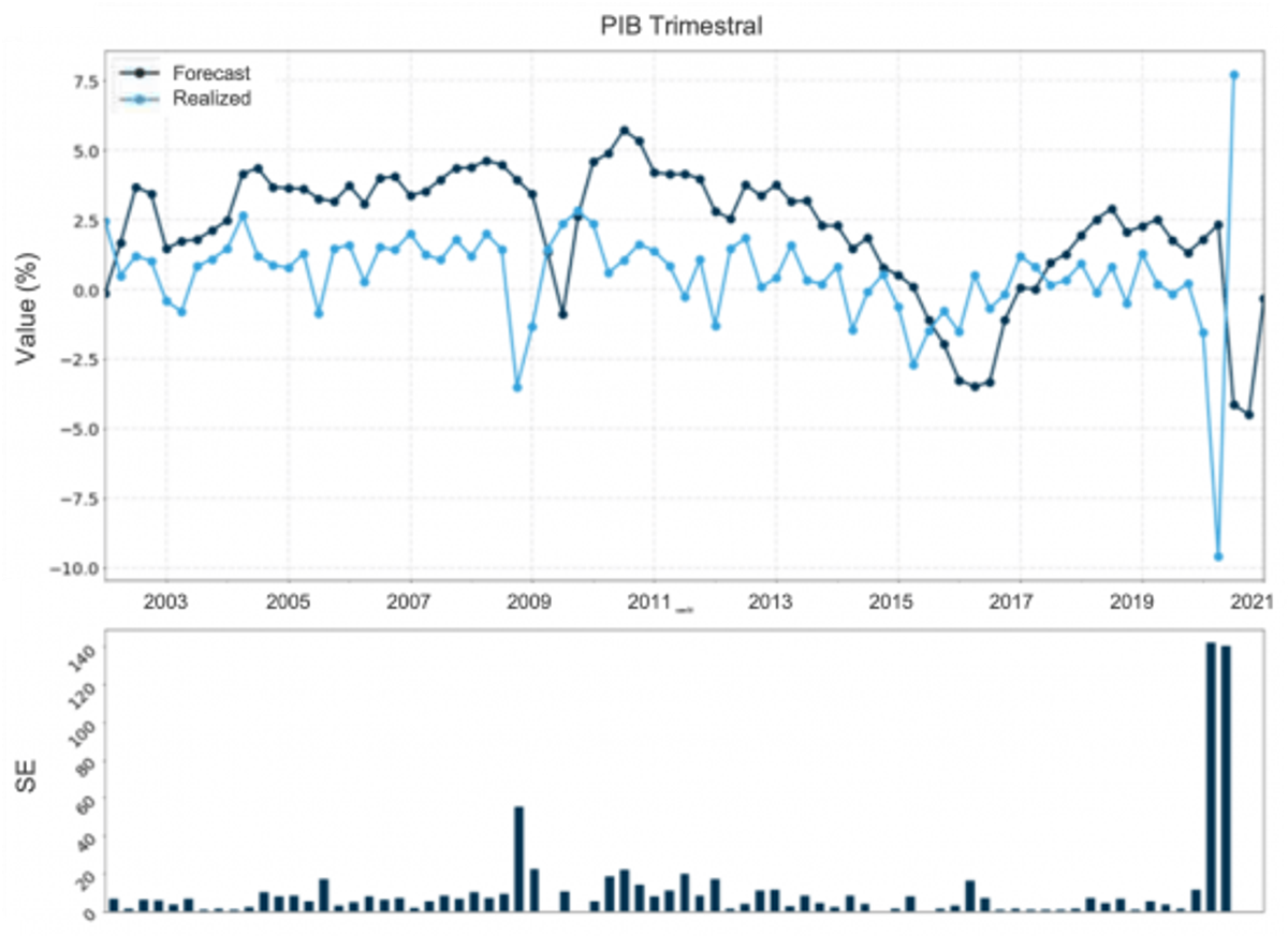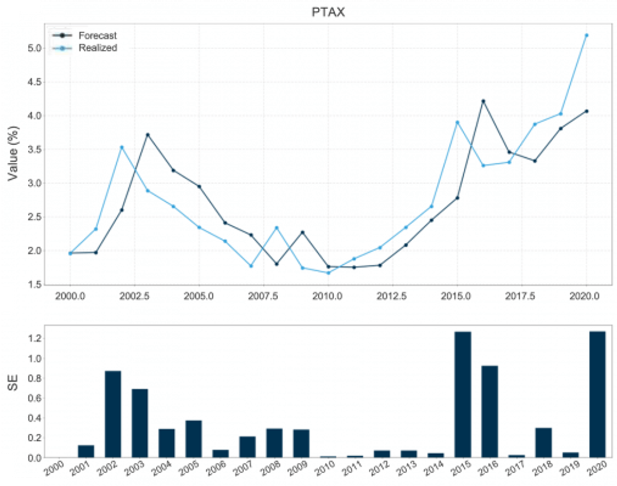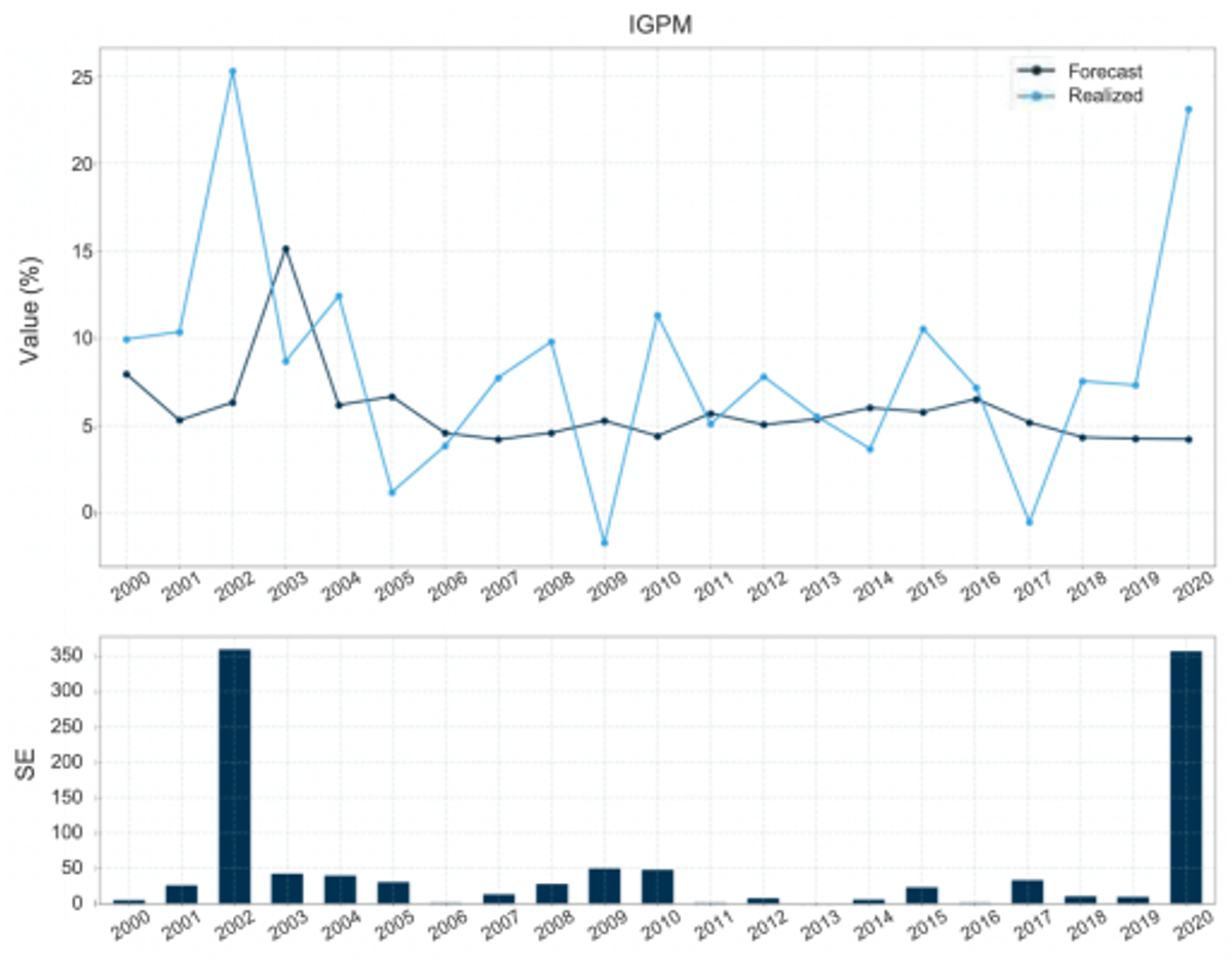 ** O ano de 2020 foi particularmente desafiador para previsões econômicas por causa da pandemia – um choque de escala global que pegou quase todos os investidores de surpresa. Isto fica evidente quando se compara a previsão dos analistas com o outcome realizado. O erro de previsão do PIB trimestral no Brasil em 2020, por exemplo, foi o maior da série (fig. 3). Taxa de câmbio e inflação do IGP-M são duas outras variáveis cujas previsões em 2020 tiveram acurácia historicamente baixa (figs. 4 e 5).