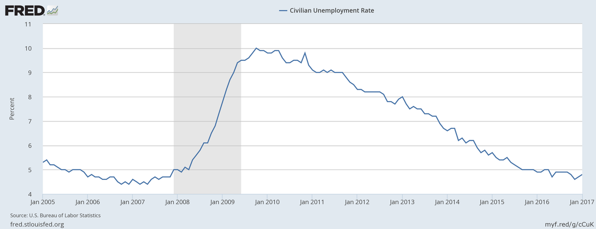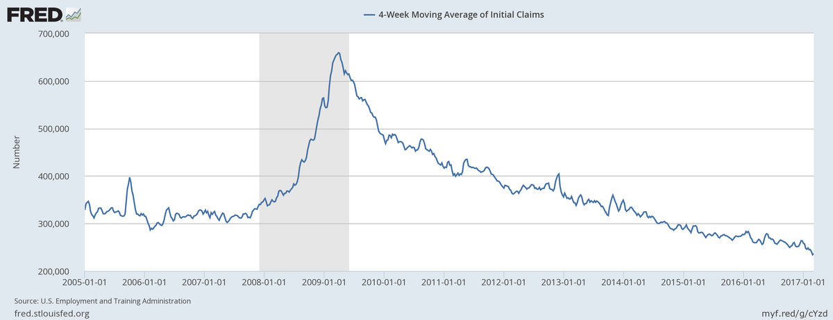 As políticas de Trump, se levadas a cabo (há dúvidas de que sua desastrada equipe reúna capacidade para tal, mas é cedo), seriam reflacionárias (isto é, tenderiam a elevar a inflação) num momento em que a economia americana vem ganhando momento de forma consistente. De fato, a economia se aproxima do pleno emprego (gráfico 1 e 2: desemprego e pedidos de seguro desemprego, respectivamente) enquanto a atividade continua a se aquecer (gráfico 3: índice de gerentes de compra).