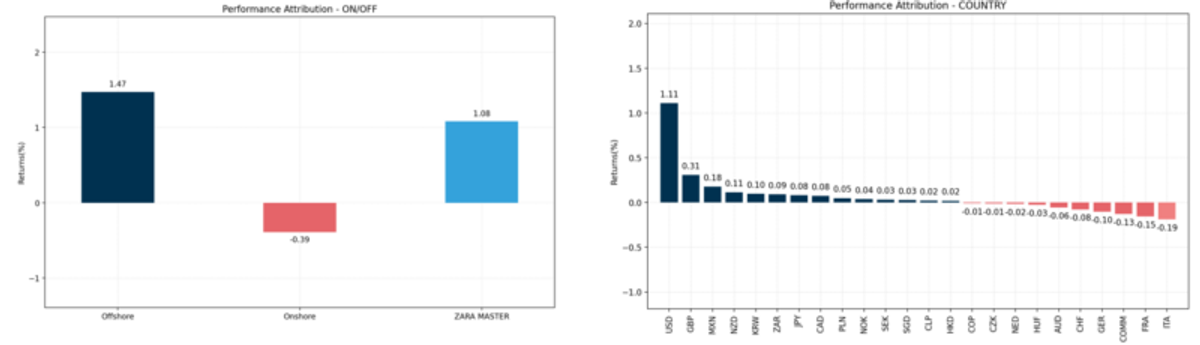 As principais detratoras de performance foram as posições compradas em bolsa local e equities offshore, e as posições vendidas em dólar contra o real.