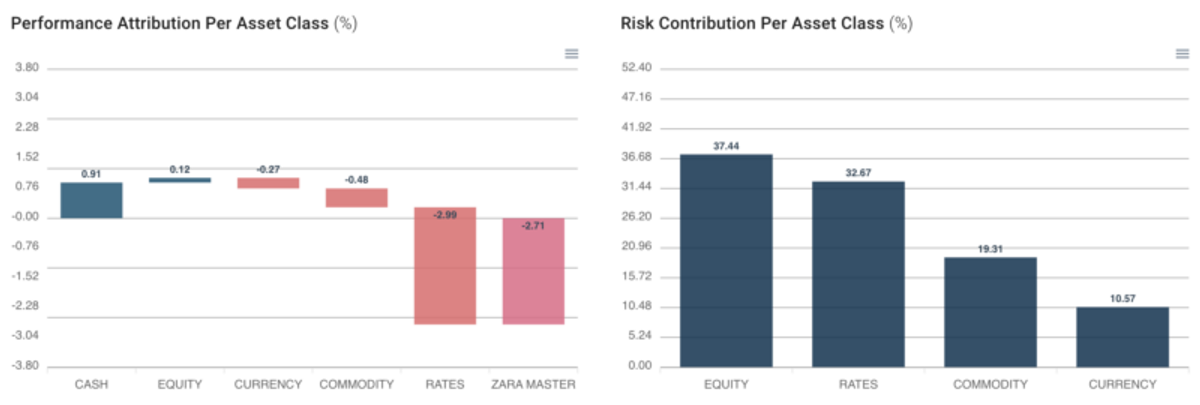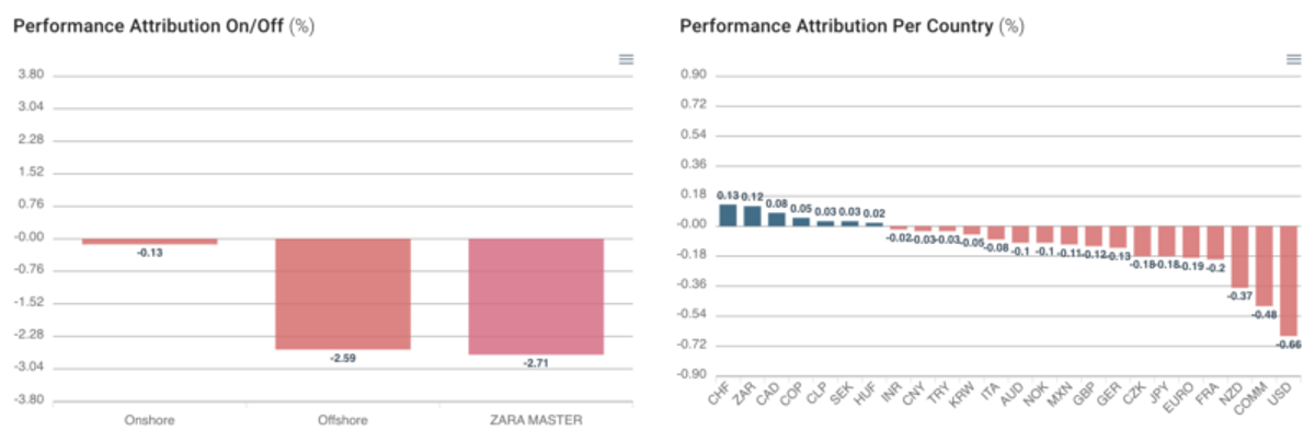 As principais detratoras de performance foram as posições tomadas em juros locais e offshore, vendidas em commodities agrícolas e compradas em equities offshore.