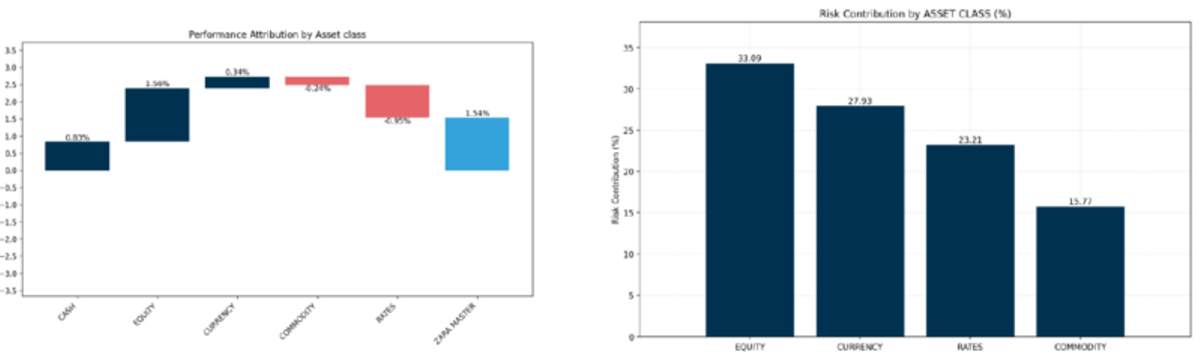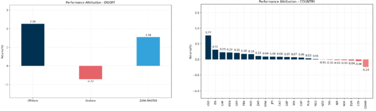 Por outro lado, o book de Commodities apresentou impacto negativo no desempenho do fundo, majoritariamente devido às posições vendidas em agrícolas. As posições em petróleo, no entanto, contribuíram positivamente, beneficiando-se da valorização da commodity em virtude dos cortes na produção promovidos pela Opep+ e das tensões geopolíticas no Oriente Médio e no Leste Europeu.