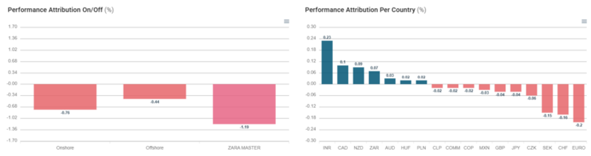 As principais detratoras de performance foram as posições long-short não direcionais em bolsa local, com destaque para posições vendidas em consumo discricionário e energia, e do book direcional de juros locais com reversões durante o período.