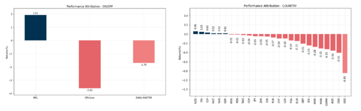 Contudo, o book de juros offshore foi afetado negativamente, sendo o principal detrator de performance do fundo, uma vez que estava tomado em países desenvolvidos, com destaque para Australia, Canadá, Estados Unidos, Reino Unido e França. No período, as posições compradas em dólar contra uma cesta de moedas também foram detratoras. O desaquecimento da atividade chinesa, redução da tensão global no que tange ao contexto do conflito entre Israel e Hamas, além da alta dos estoques de petróleo, influenciaram a queda do preço da commodity. As posições compradas em petróleo foram as principais responsáveis pelo resultado negativo do book.