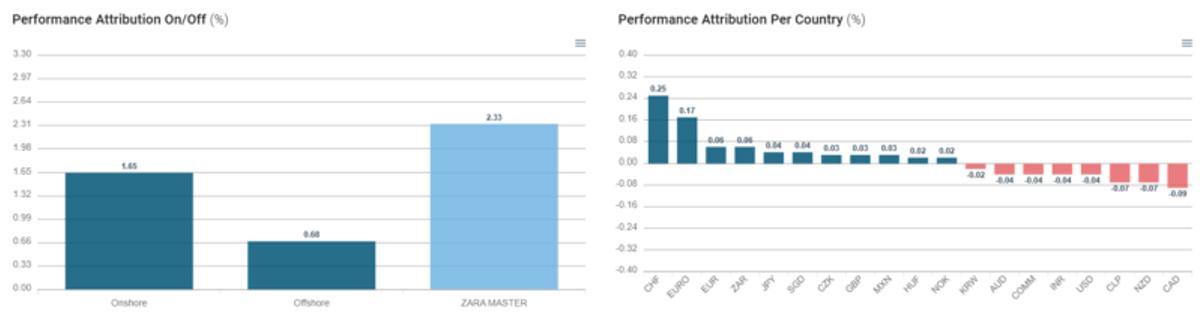Dessa forma, as posições compradas em dólar contra uma cesta de moedas foram promotoras de performance no mês. O book de juros offshore teve baixo risco alocado, porém capturou a abertura da curva de juros americana com posições tomadas. Destaque também para o alpha gerado com posições aplicadas na Suíça, resultado da queda dos juros futuros do país devido à desaceleração da inflação pelo terceiro mês seguido.