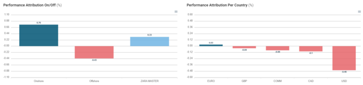 Neste ambiente de expectativas mistas, o book direcional de juros offshore fechou o mês com um resultado levemente negativo, com destaque para posições relativas em juros US e Canadá. O book de FX também figurou como fator detrator da performance, devido a posições compradas em dólar contra uma cesta moedas, que sofreram reversão no período. Já o book de commodities apresentou contribuição neutra, dada o baixo risco alocado em resposta à forte volatilidade sem direcional.
