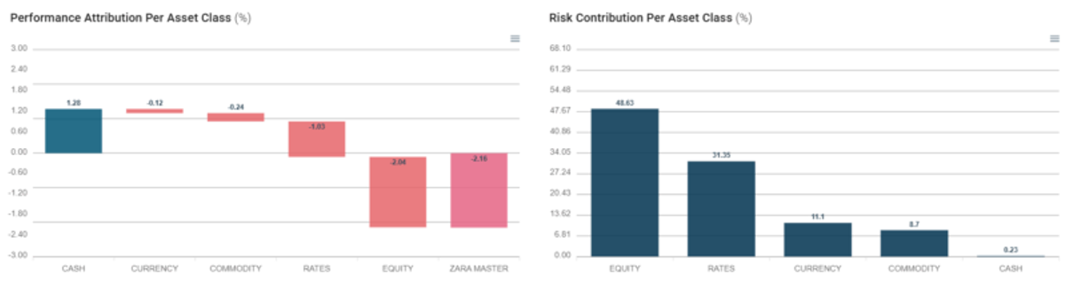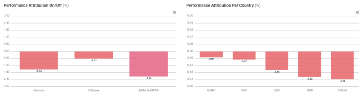 Em outubro, o resultado do Zarathustra foi de –2,23%. O book local de equities long short foi o principal detrator de performance do período, com destaque negativo para as posições short Financials e long Energy.