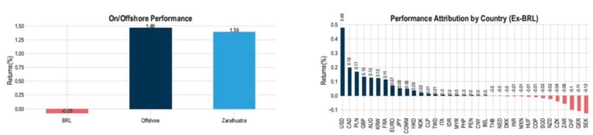 Dessa forma, o book de juros globais foi o principal promotor de performance do fundo, com posições tomadas, com destaque para Austrália, França, Canadá e Estados Unidos. Outro destaque foi a posição aplicada em juros na Polônia, que capturou o corte de 75 bps realizado pelo banco central polonês no início do mês.