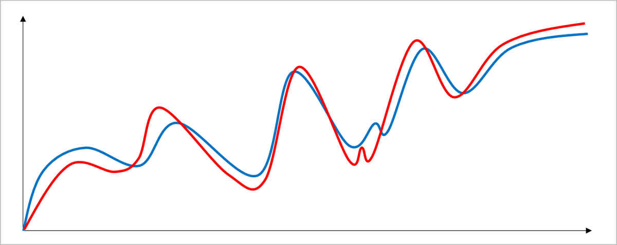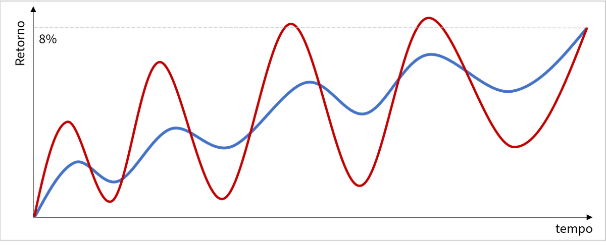 No caso acima, ambos os investimentos atingiram a mesma média de retorno, porém o desvio padrão do ativo em vermelho é maior. Em outras palavras, quanto mais intenso é o movimento do ativo, mais volátil ele é.