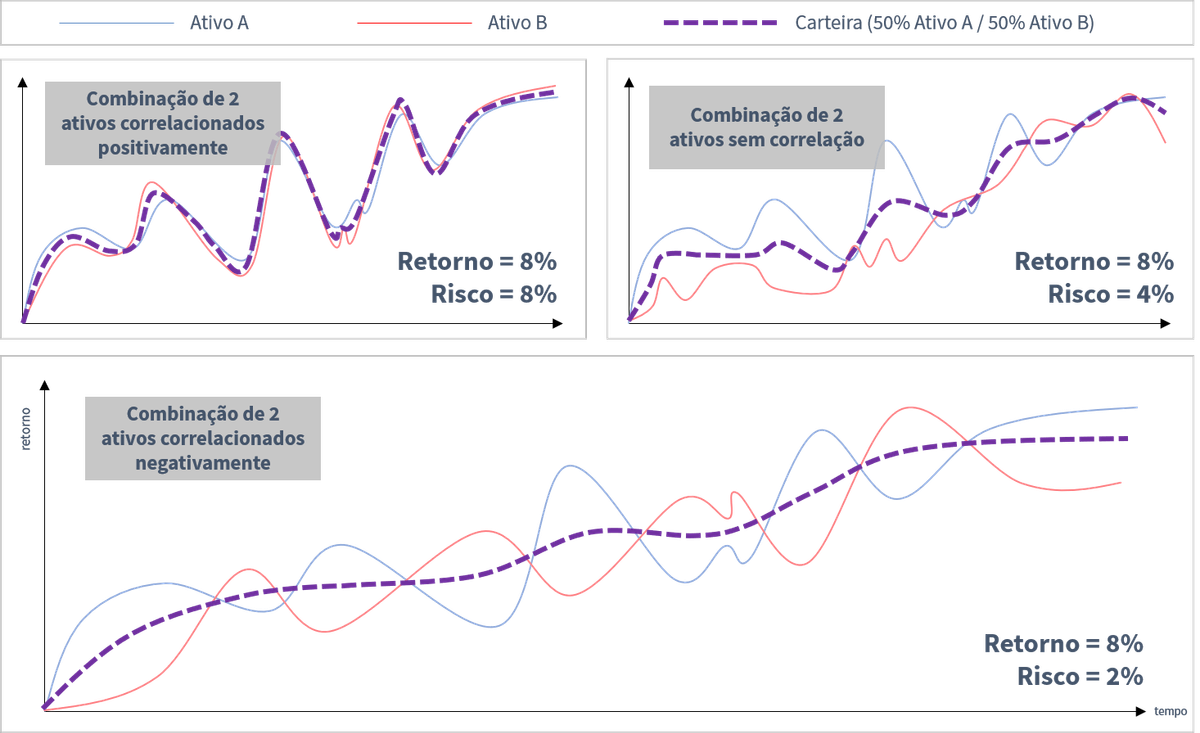 Note que o retorno, nos três casos, atingiu o mesmo resultado de 8%. Porém, no caso de dois ativos negativamente correlacionados (último gráfico), o portfólio quase não tem risco, porque quando um ativo ganha, o outro perde, equilibrando o risco da carteira.