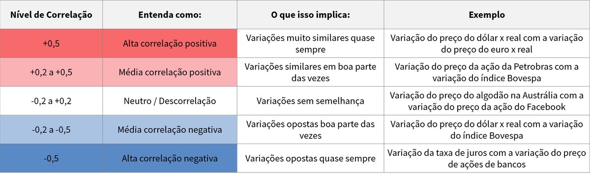 Na prática, quanto mais correlacionados, mais os ativos irão variar de forma parecida. A correlação pode ir de -1 até +1, segundo as regras a seguir: