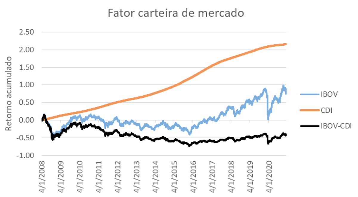 A diferença entre o IBOV e o CDI também pode ser vista como o desempenho de uma carteira que toma emprestado à taxa CDI para investir no Ibovespa (carteira de custo zero). Essa carteira teve um retorno negativo de mais de 40% ao longo desse período.