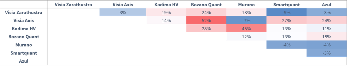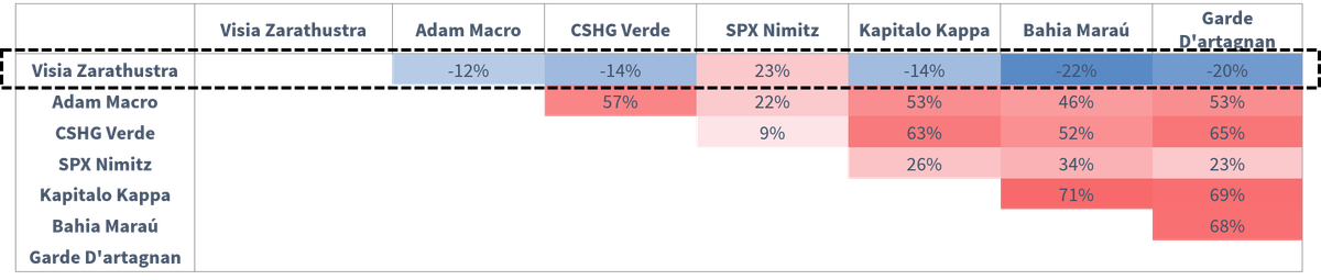 A descorrelação do segmento quantitativo é um aspecto que impressiona. A tabela abaixo mostra uma análise de correlação de alguns dos principais fundos macro no Brasil e o fundo quantitativo Zarathustra.