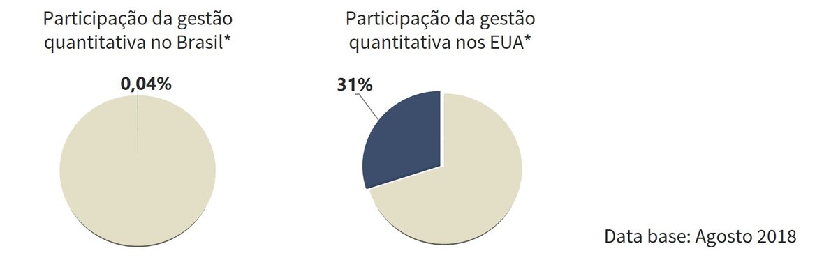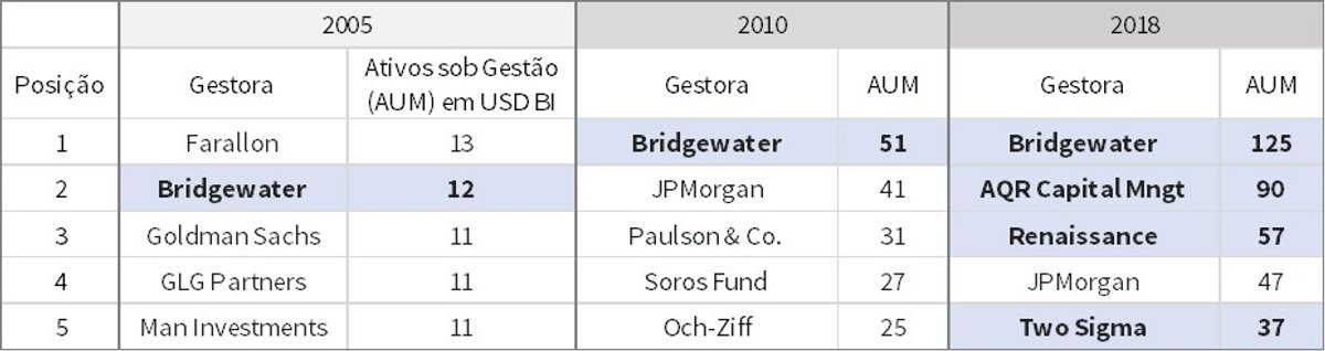 O crescimento do segmento foi notável. Pouco mais de 10 anos atrás, apenas um hedge fund quantitativo figurava entre as 5 maiores gestoras dos Estados Unidos: A Bridgewater, do gestor Ray Dalio. Em 2018, apenas o JP Morgan se mantém no top 5 como não quantitativo, embora parte dos investimentos já seja baseada em algoritmos.