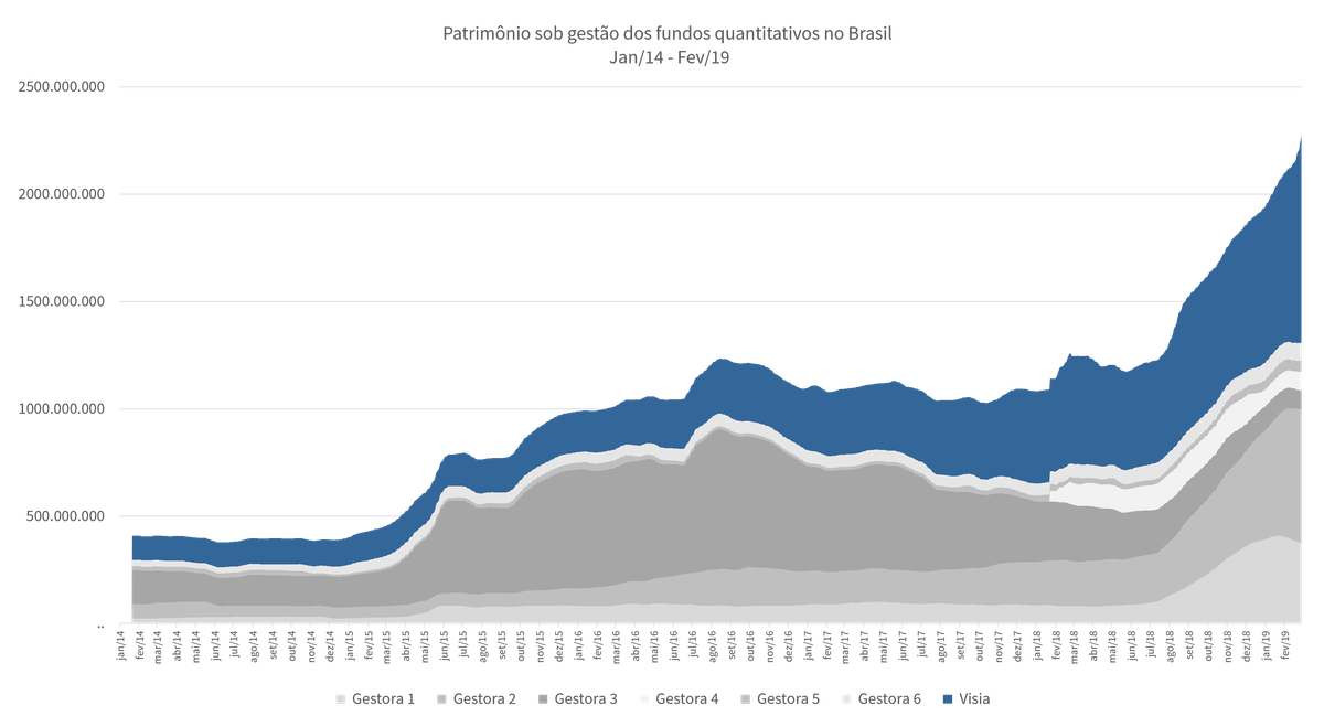 O setor é, portanto, extremamente promissor – e começa a ser desenvolvido. No período de 2008 a 2017 a indústria de fundos no Brasil cresceu na taxa média mensal de 1,08%, enquanto o segmento de fundos quantitativos cresceu 3,80% – e está acelerando – totalizando pouco mais de R$ 2 bilhões em fevereiro 2019, de acordo com dados extraídos do ranking ANBIMA e CVM.