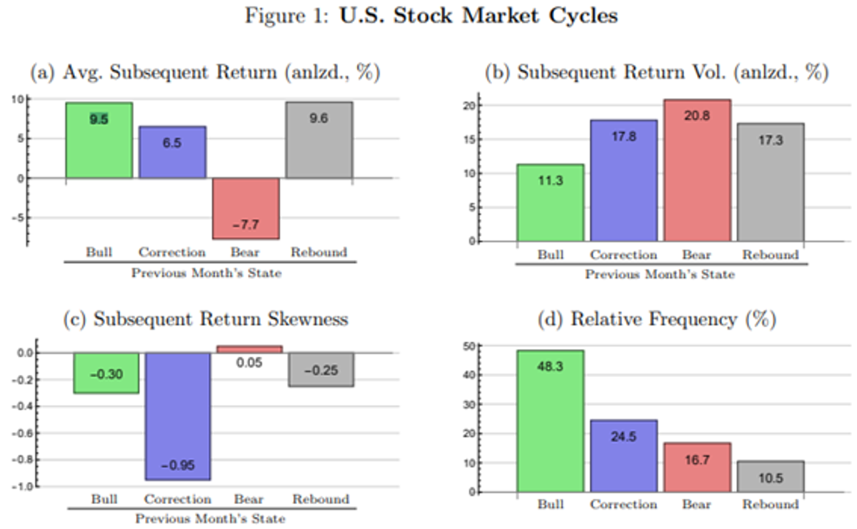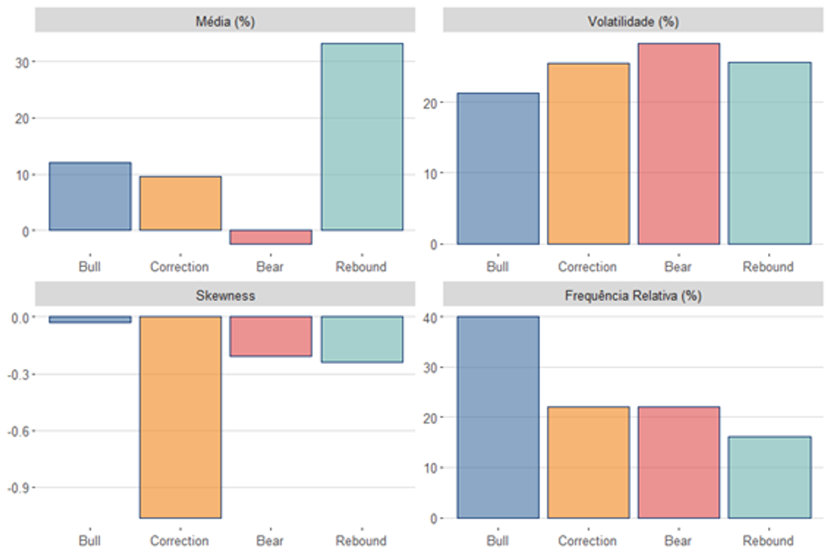 No artigo Momentum Turning Points (2022), os autores identificaram que, para o mercado americano, existem comportamentos bastante distintos de retorno esperado, volatilidade e assimetria de retornos, conforme os quatro estados de mercado (Bull, Correction, Bear e Rebound).