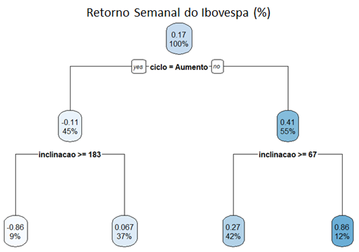 Na árvore decisão abaixo ilustramos a interação entre as variáveis Ciclo da Selic (aumento e redução de juros) e Inclinação da Curva de Juros (em bp). O nó mais acima da figura contém todos os pontos da amostra.