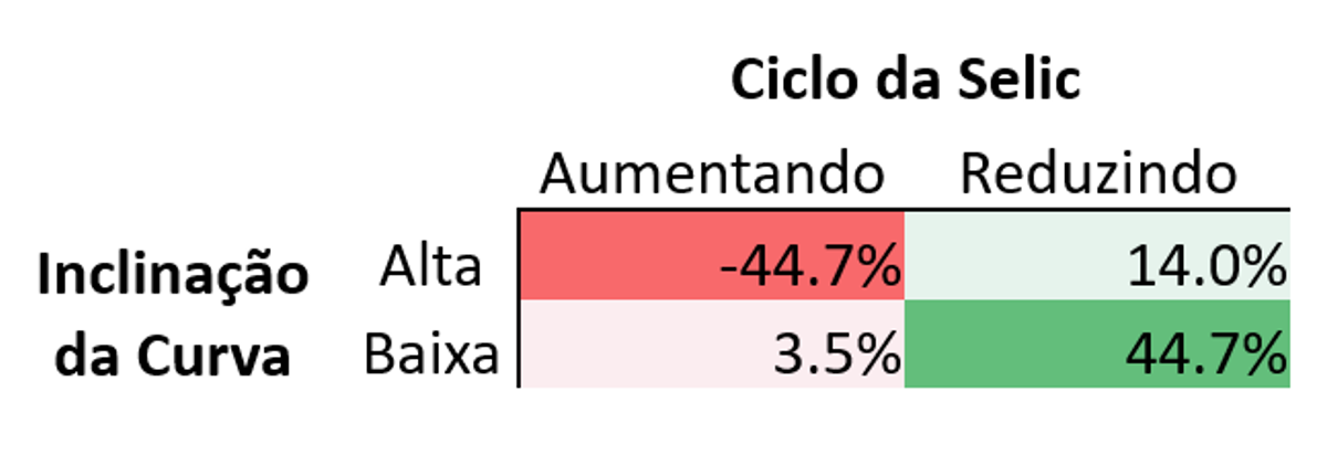 Resumindo: incorporar os juros longos e curtos à análise de ciclos claramente contribui para uma avaliação mais precisa do comportamento do Ibovespa e potencial de valorização das empresas. Trazendo para uma tabela a árvore de decisão acima (mais tosco, porque perdemos os pontos de quebra distintos para a variável Inclinação da Curva), temos os seguintes retornos históricos anualizados do Ibovespa para cada um dos cenários:
