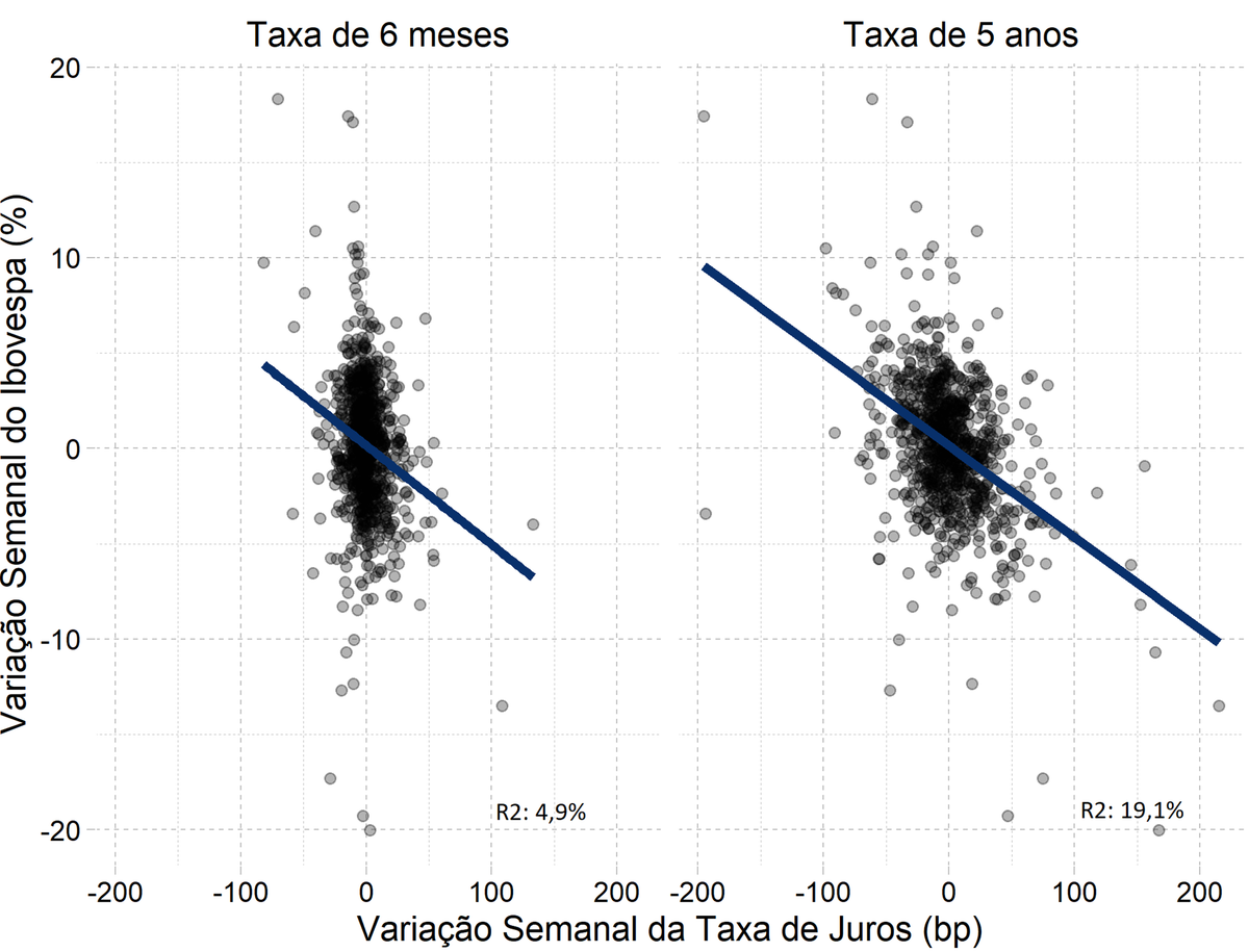 Já a figura abaixo exemplifica o que os leitores corretamente apontaram. A variação do Ibovespa no dia a dia é mais explicada pela oscilação das taxas de juros mais longas. Em média, a cada 10bp de fechamento (redução) na taxa de juros de 5 anos, o Ibovespa avança 0,48% na semana. Para a taxa de 6 meses, a magnitude das variações é próxima (+0,52% a cada -10bp), no entanto, com menor poder explicativo (R2 bem menor) (1).