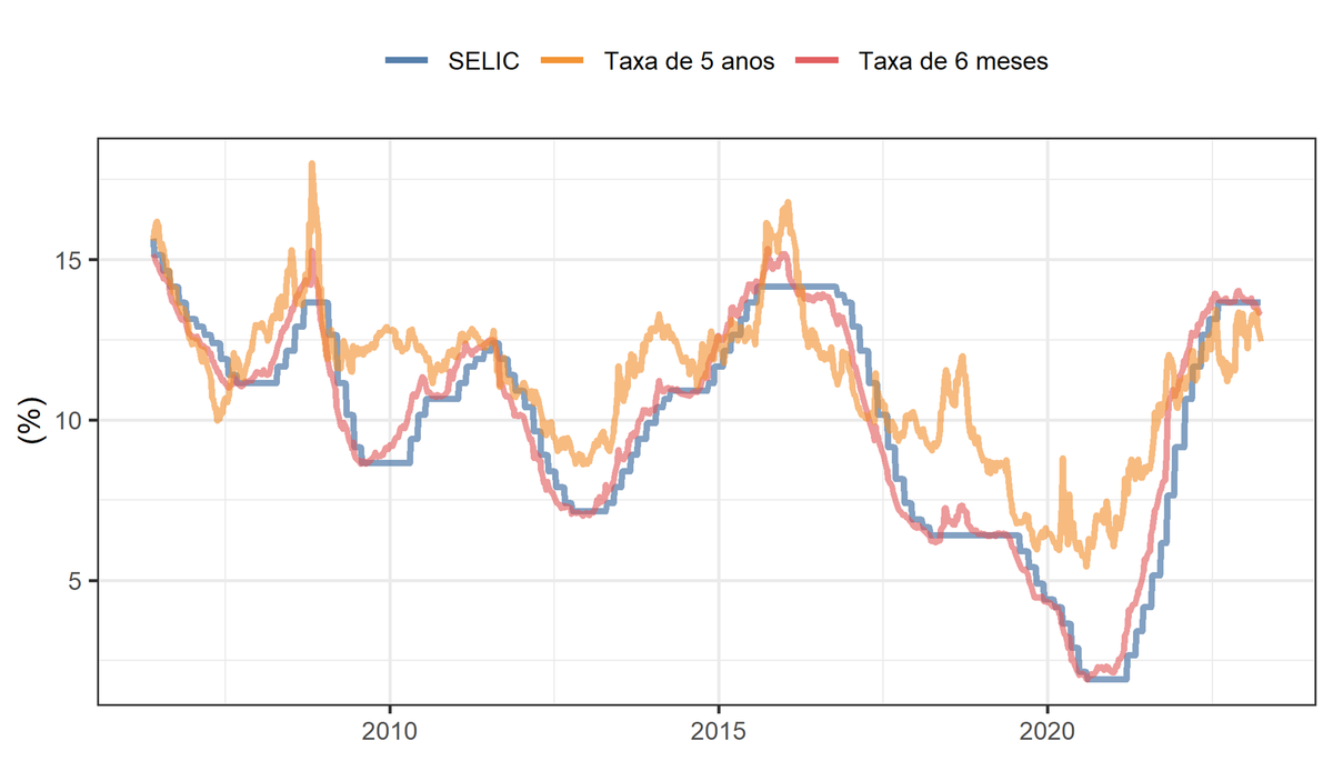 A figura abaixo ilustra bem a dificuldade de adotar o conceito de ciclo para as taxas mais longas. Note que a taxa de 5 anos, embora sofra influência da Selic, é muito mais governada por expectativas. Já a taxa de 6 meses, mesmo sendo negociada diariamente, está fortemente ligada ao comportamento da Selic e antecipa, na maior parte das vezes, o seu movimento.