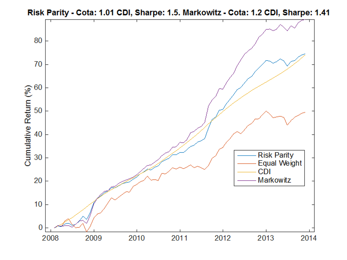 Nas figuras 1 e 2, observamos que as alocações com risk-parity evoluem lentamente para acompanhar as mudanças na volatilidade dos ativos e correlações entre os mesmos. Por outro lado, a carteira ótima do modelo de Markowitz é bastante concentrada e depende em grande parte de quais classes de ativos obtiveram o melhor desempenho nos últimos dois anos. Note, porém, que a carteira de risk-parity diminui sua alocação IBOV durante os anos da crise de 2008, voltando a investir quando o índice volta a crescer. Da mesma forma, a exposição nos ativos vinculados à taxa de juros tende a oscilar com a volatilidade.