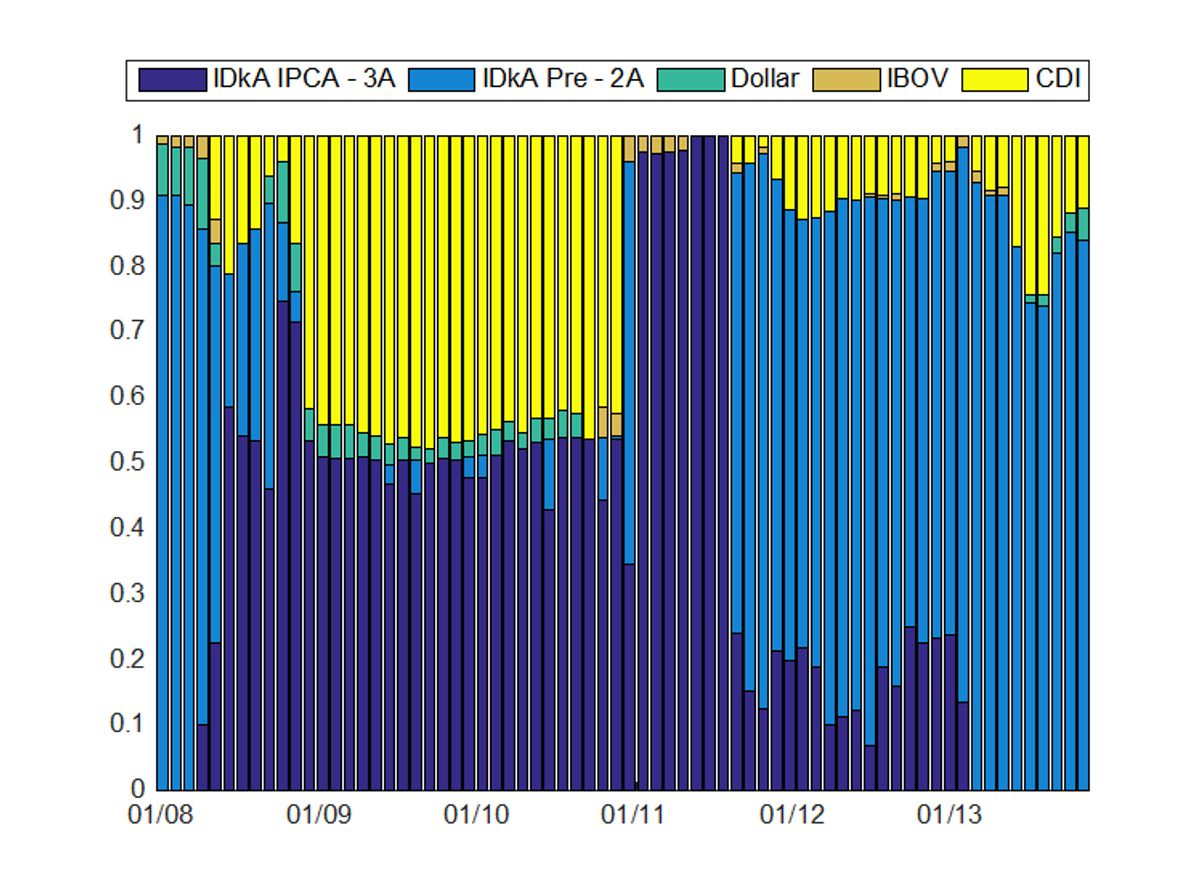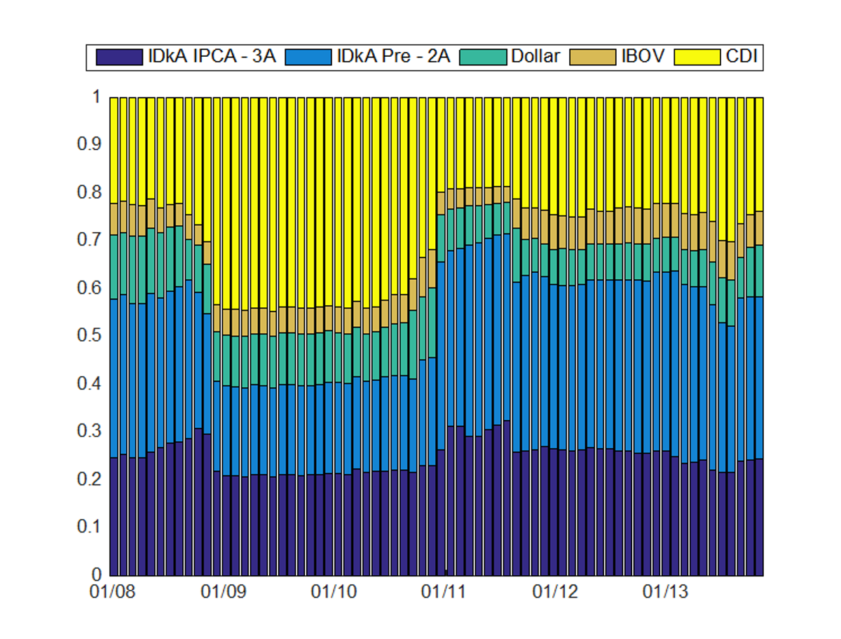 Simulamos carteiras que alocam em cinco classes de ativos: Ibovespa, títulos de renda fixa pré-fixados com duração fixa de dois anos (IDkA Pré – 2A), títulos indexados a inflação com duração fixa de três anos (IDkA IPCA – 3A), dólar futuro e títulos pós-fixados. As carteiras eram recalibradas mensalmente, no período de janeiro de 2008 a dezembro de 2013.
