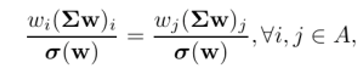 Por definição, a soma das contribuições de risco de cada ativo é igual ao risco total da carteira – no nosso exemplo, a variância σ(w) . Além disso, a carteira baseada em paridade de risco é caracterizada pela igual contribuição de risco de cada ativo. Utilizando a medida risco do nosso exemplo, onde A é o conjunto de ativos selecionados para compor a carteira: