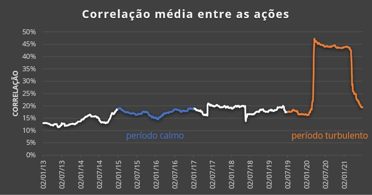Finalmente, a correlação entre os ativos varia ao longo do tempo. Em tempos de maior volatilidade no mercado (crises, por exemplo), os ativos tendem a ter um comportamento mais parecido, aumentando a correlação entre eles.