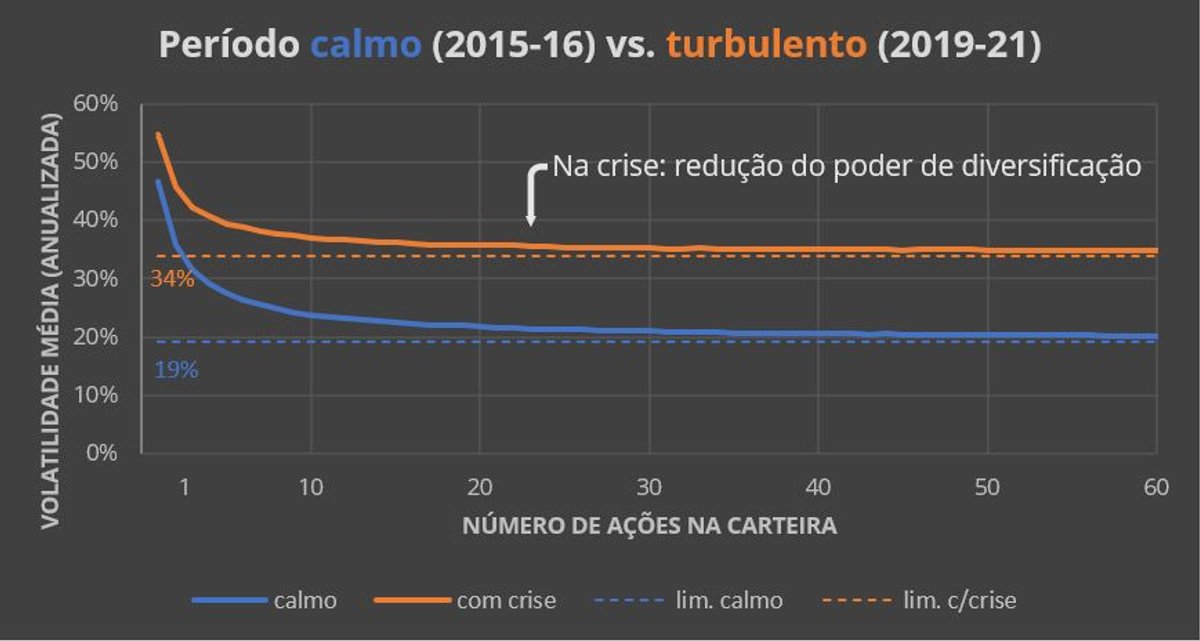 O gráfico a seguir compara o resultado para os dois períodos (calmo vs. turbulento). Fica claro que, para o período turbulento, o poder de diversificação é menor. No máximo, nós conseguimos uma redução de apenas 38% (=(55-34)/55) da volatilidade total da carteira. Resultado, quando se mais precisa de proteção, a diversificação tem o menor efeito.