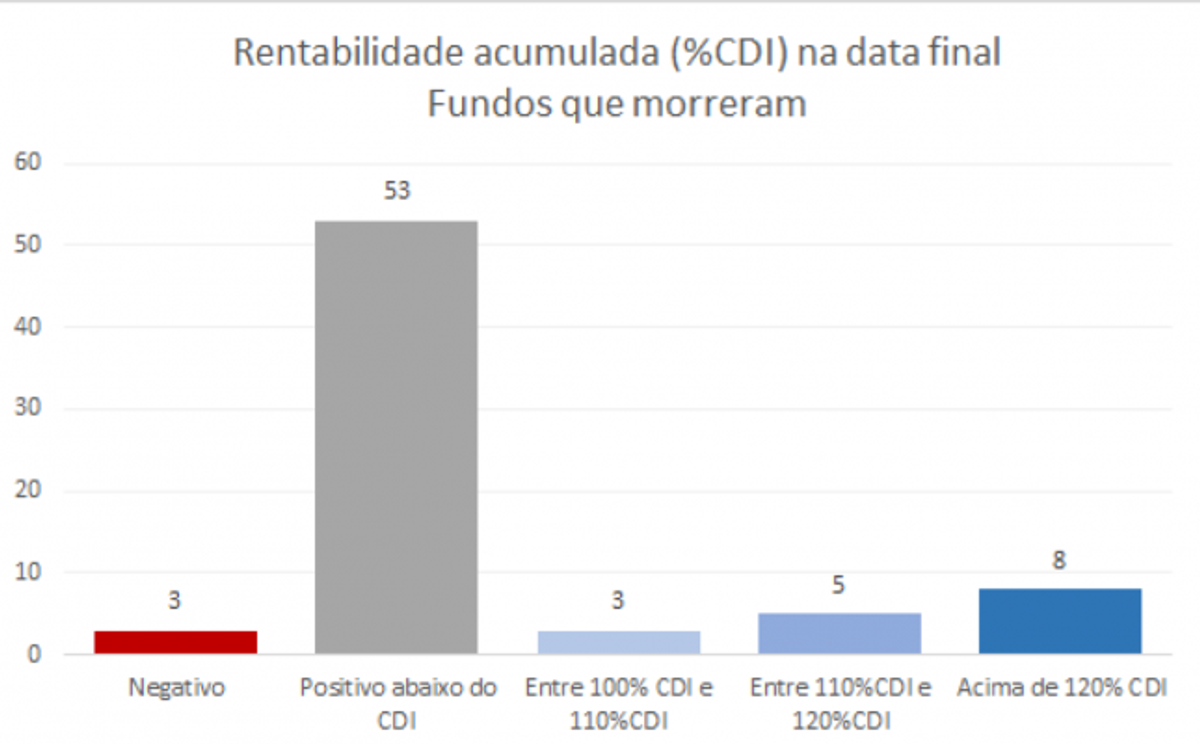 Dos 72 fundos que descontinuaram suas operações em nossa amostra, 53 deles tiveram um retorno abaixo do CDI em contagem feita a partir do primeiro dia útil de 2010 e indo até a data de encerramento dos fundos. Os demais, que superaram o CDI, o fizeram com margem baixíssima na maior parte dos casos.