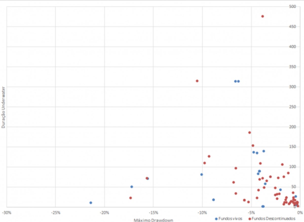 A análise do máximo drawdown (pior queda do fundo, a partir de 2010 ) e do tempo (em dias úteis) que o fundo demorou para se recuperar da queda (underwater) não revelou nenhum padrão que poderia explicar a mortalidade dos fundos.