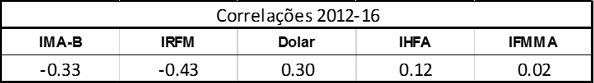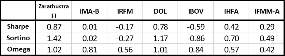 A maior correlação (em módulo) foi com o IRFM, índice de títulos de renda-fixa. Essa correlação provavelmente esteja sobre-estimada simplesmente porque foi calculada num período em que a cota do Zarathustra se valorizou consistentemente e os títulos de renda-fixa, em geral, sofreram fortes quedas (sem que um movimento tivesse relação causal com a outro).