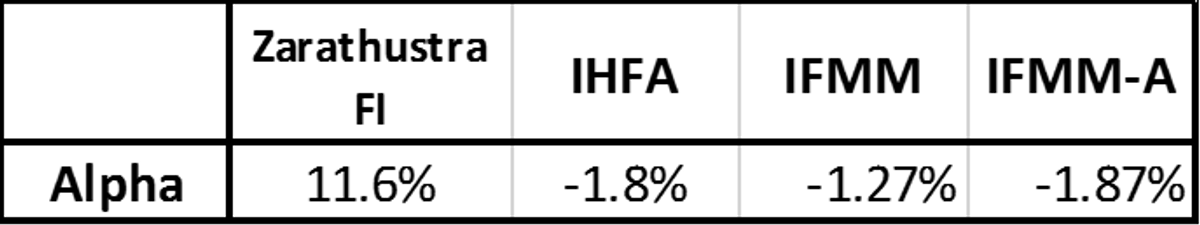 Outra forma de medir a eficácia da gestão é analisando-se os coeficientes de regressão dos retornos excedentes contra os benchmarks. Os coeficiente são os chamados ‘beta’ e representam a parcela do resultado explicada pelo respectivo benchmark. O que sobra, o intercepto da regressão chamado alpha, representa o quanto do retorno excedente se deve, efetivamente, à gestão. Para o período de quatro anos do Giant Zarathustra FIM, utilizando Ibovespa, dólar e IMA-B como benchmarks se obtém a alpha anualizado de 11.6% (tabela 3). Ou seja, quase todo retorno excedente pode ser explicado pela gestão. A mesma regressão para o IHFA, IFMM e IFMM-A, índices de fundos multi-mercado, obtém-se alphas anualizados baixos e negativos, o que sugere que a gestão tenha sido, em média, prejudicial ao desempenho dos fundos.