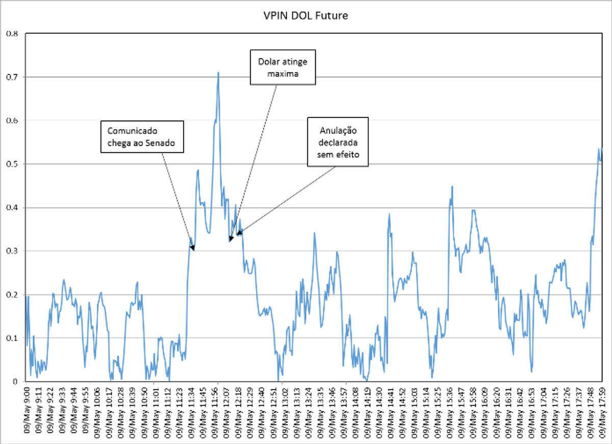 O VPIN do contrato de dólar começa a subir antes mesmo da entrega ofical do comunicado da anulação e atinge um pico de 0.71, maior ainda do que no flash crash, e antes do dólar atingir a máxima. Isso sugere que a assimetria de informação e desbalanceamento de ordens tenha sido ainda maior no futuro de dólar do que no S&P 500. Sob esse aspecto, o movimento do dólar teria sido ainda mais “tóxico” do que o do futuro de S&P no flash crash. Uma hipótese explicativa para isso é que, diferente do flash-crash, o comportamento do dólar tenha tido um fator desencadeante bem definido. O incentivo para se operar em cima dessa informação, portanto, fosse possivelmente maior do que no flash crash – em que os agentes em geral estavam em estado de perplexidade.