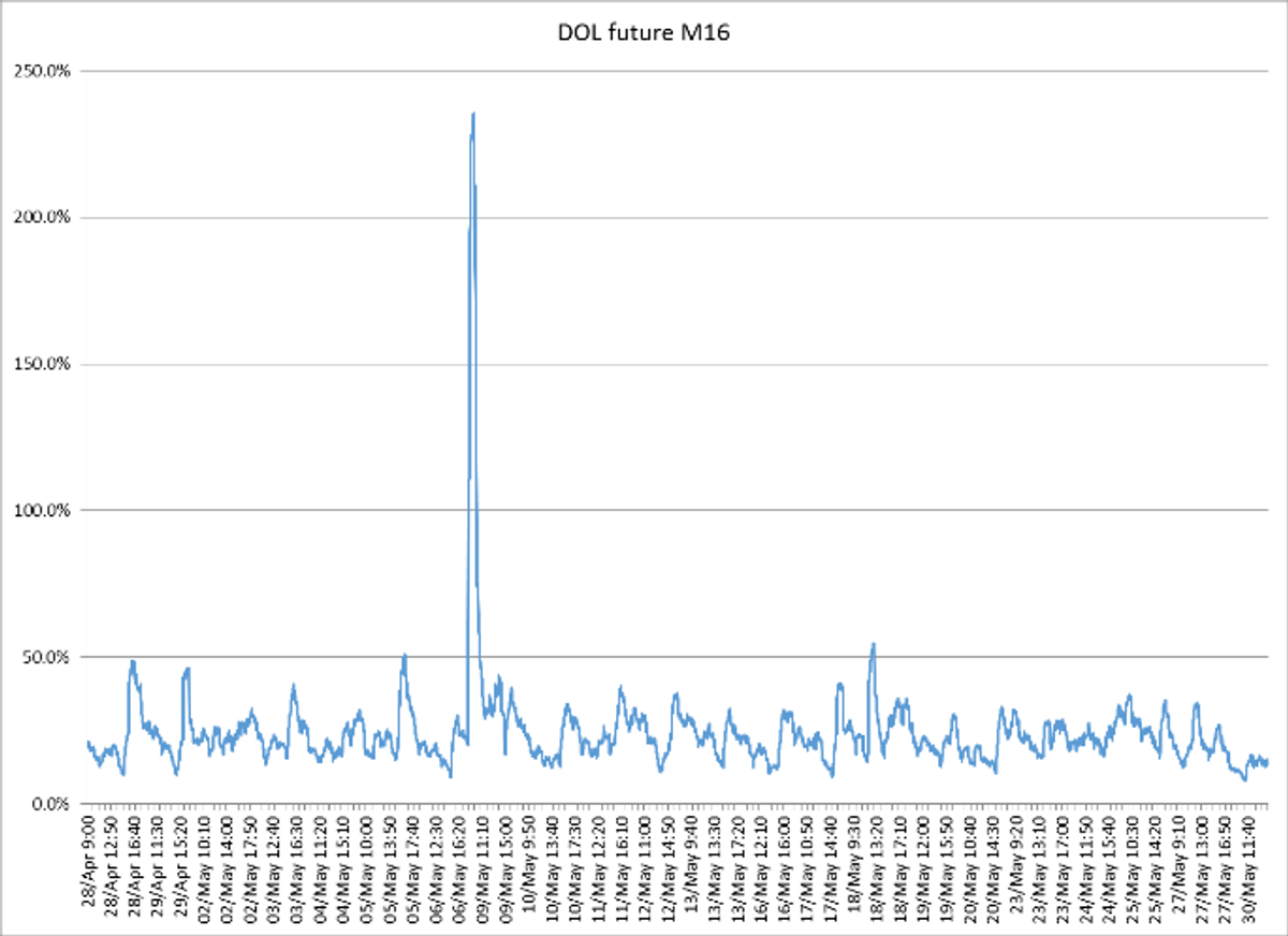 A comunicação da anulação do impeachment expedida por Maranhão chegou ao senado às 11:37h, quando o contrato de dólar futuro com vencimento em junho negociava a 3547. Na meia hora seguinte a cotação subiu cerca de 1.5% e, entre 12:02h e 12:12h, disparou até a máxima de 3700, 4.3% acima da cotação no horário do comunicado (ver figura 3). A partir desse ponto a cotação começou a cair rapidamente: às 12:32h o presidente da Comissão de Impeachment deu entrevista a uma rádio declarando “sem efeito” a anulação. Outras autoridades fizeram coro ao presidente e, às 13:02h a o contrato já negociava a 3572. O último negócio do pregão foi a 3540, pouco acima da cotação na abertura. Diferente da CME onde negocia o futuro de S&P 500, a BM&F suspende negociações e realiza leilão sempre que o preço do ativo ultrapassa determinado nível (0.5% no caso do dólar). No dia da anulação do impeachment foram realizados cinco leilões (que aparecem como “buracos” na série de dados), dilatando a duração do movimento e, provavelmente, atenuando sua volatilidade. De toda forma, pode se observar que o comportamento dos dois mercados guarda grandes semelhanças. A volatilidade da série do futuro de dólar – que, assim como o índice americano, vinha oscilando entre 10% e 50% – tem um pico 234% e rapidamente retorna ao nível anterior (figura 4). Diferente do S&P, não se observa aftershocks de volatilidade na série do dólar – talvez porque, à diferença do S&P 500, não seja um mercado de 24h.