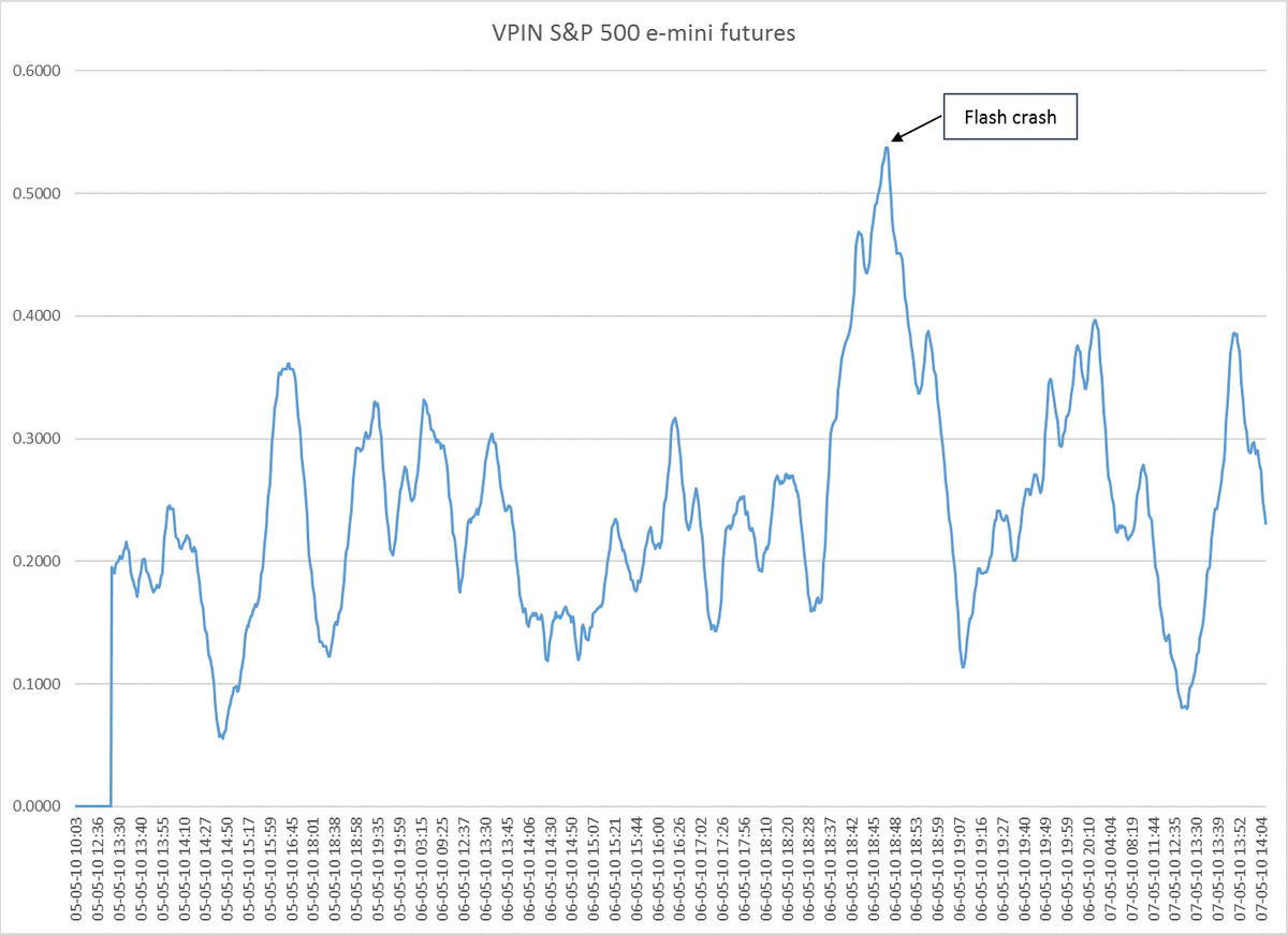 Para analisar situações de informação assimétrica em mercados financeiros, Easley et al (2011) desenvolveram o índice VPIN (Volume-Synchronized Probability of Informed Trading), que busca estimar a “toxicidade” do fluxo de ordens. Em particular, os autores aplicam a métrica para analisar o flash crash da bolsa americana em maio de 2010¹.