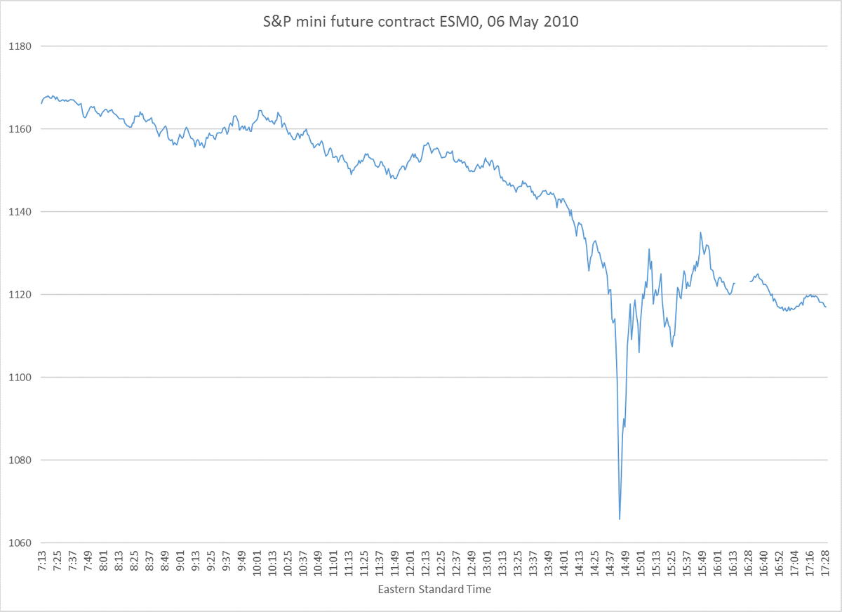 No dia 6 de maio de 2010 os mercados estavam apreensivos com tremores vindos dos países periféricos da Europa, então às voltas com dificuldades de refinanciamento de dívida. Naquela fatídica quinta-feira o índice S&P 500 negociava ao redor de 1165 pontos e, ao longo de toda manhã de Nova Iorque, operara pressionado, com baixa liquidez e volatilidade atipicamente elevada. Ao meio-dia local caía 2% em relaçao à abertura. Por volta de 13:00h a perda começou a se acelerar e, às 14:21h, caíra a 1125 pontos, ou -3.4%. O índice voltaria a subir a 1133.75 às 14:27h quando então entrou em queda livre chegando, às 14:45h, à mínima de 1056 – um colapso de 6.8% em 18 minutos. Nesse ponto o indice engatou forte recuperação: às 14:56h, voltara a 1116.75 – 5.75% de alta praticamente ininterrupta. Às 15:08h voltara ao patamar de 1131, recuperando quase toda a perda do dia em 23 minutos. Em 41 minutos, a oscilação até a mínima e de volta fora de mais de 13% (figura 1). Pode se ver que a volatilidade da série, que nos dias anteriores situara-se entre 10% e 50% (dados de 1 minuto, janela de 60 minutos, anualizada) atinge um pico de 300% durante o flash crash. Horas depois ocorre um segundo pico de volatilidade, menor – possivelmente ocasionado pela abertura do mercado europeu – a partir do qual a série retorna ao regime de volatilidade anterior (figura 2).